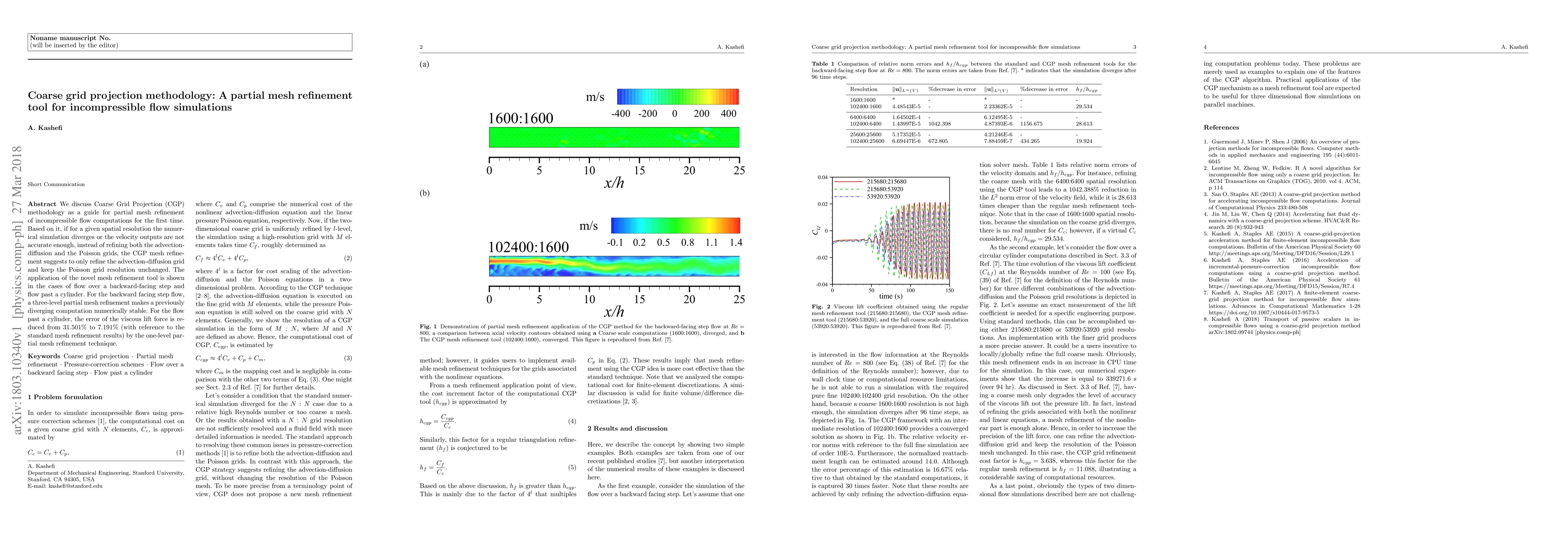 The Coarse Grid Projection (CGP) methodology introduces a partial mesh refinement technique for incompressible flow simulations, refining only the advection-diffusion grid while keeping the Poisson grid resolution unchanged to enhance stability and accuracy. This approach effectively reduces errors in simulations, as demonstrated by improved results in flow over a backward-facing step and flow past a cylinder.