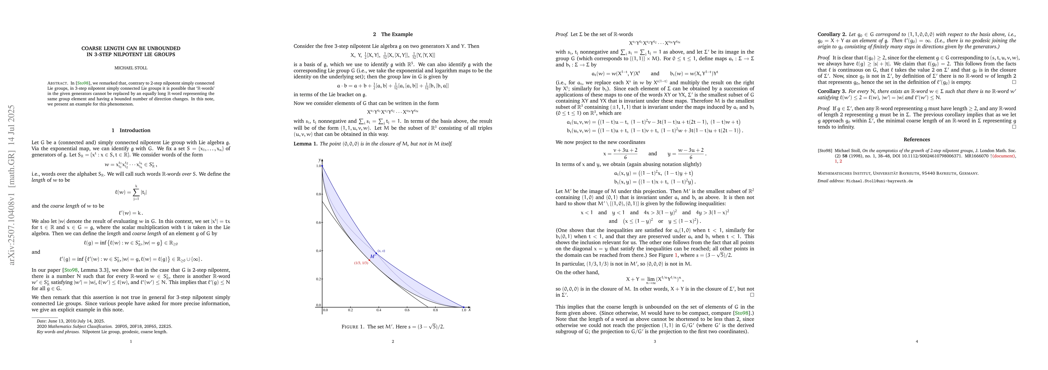 In "On the asymptotics of the growth of 2-step nilpotent groups" (J. London Math. Soc. (2), 58 (1998)), we remarked that, contrary to 2-step nilpotent simply connected Lie groups, in 3-step nilpotent simply connected Lie groups it is possible that `$\mathbb{R}$-words' in the given generators cannot be replaced by an equally long $\mathbb{R}$-word representing the same group element and having a bounded number of direction changes. In this note, we present an example for this phenomenon.