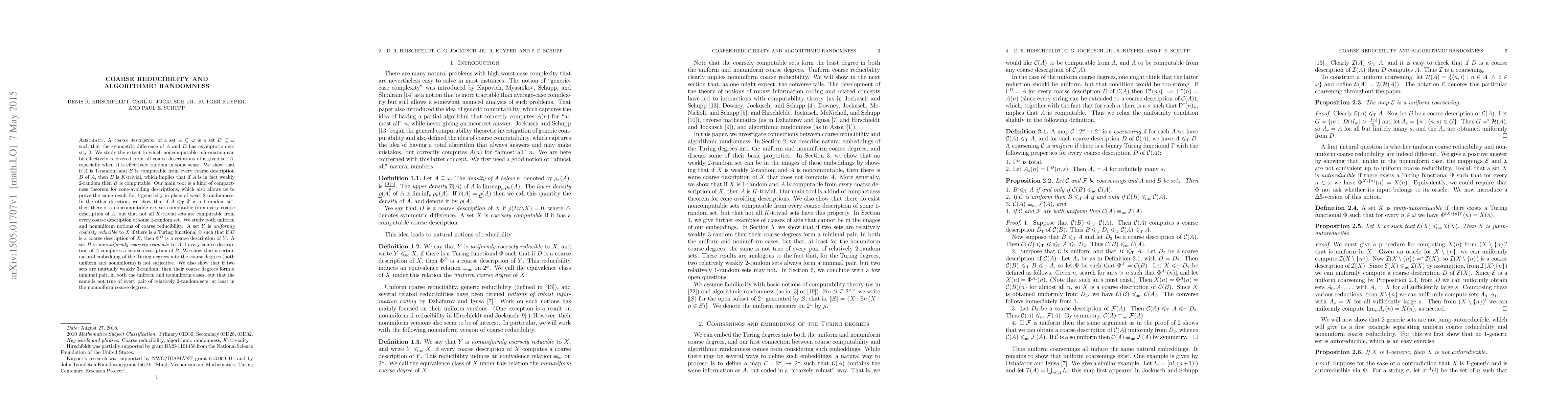 A coarse description of a subset A of omega is a subset D of omega such that the symmetric difference of A and D has asymptotic density 0. We study the extent to which noncomputable information can be effectively recovered from all coarse descriptions of a given set A, especially when A is effectively random in some sense. We show that if A is 1-random and B is computable from every coarse description D of A, then B is K-trivial, which implies that if A is in fact weakly 2-random then B is computable. Our main tool is a kind of compactness theorem for cone-avoiding descriptions, which also allows us to prove the same result for 1-genericity in place of weak 2-randomness. In the other direction, we show that if A is a 1-random set which Turing-reduces to 0', then there is a noncomputable c.e. set computable from every coarse description of A, but that not all K-trivial sets are computable from every coarse description of some 1-random set. We study both uniform and nonuniform notions of coarse reducibility. A set Y is uniformly coarsely reducible to X if there is a Turing functional Phi such that if D is a coarse description of X, then Phi^D is a coarse description of Y. A set B is nonuniformly coarsely reducible to A if every coarse description of A computes a coarse description of B. We show that a certain natural embedding of the Turing degrees into the coarse degrees (both uniform and nonuniform) is not surjective. We also show that if two sets are mutually weakly 3-random, then their coarse degrees form a minimal pair, in both the uniform and nonuniform cases, but that the same is not true of every pair of relatively 2-random sets, at least in the nonuniform coarse degrees.