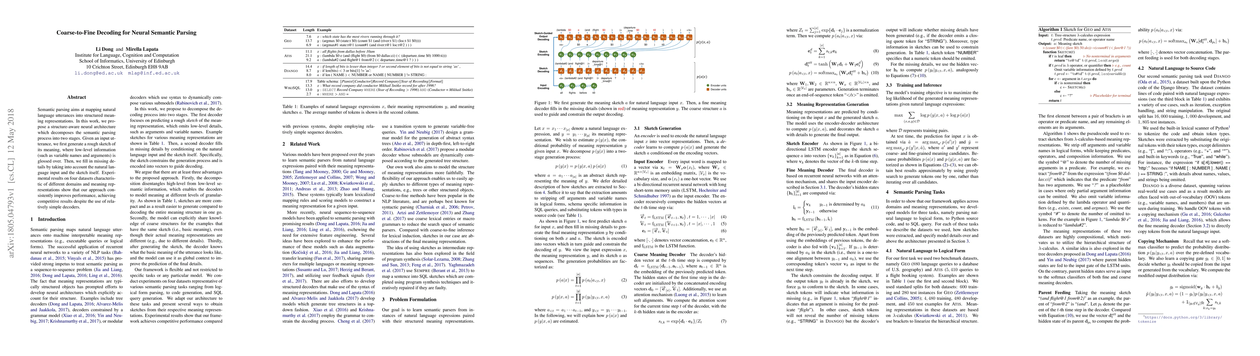 This paper proposes a two-stage neural architecture for semantic parsing that first generates a rough sketch of an utterance's meaning, then refines it by incorporating low-level details. Experimental results show consistent performance improvements across diverse datasets.