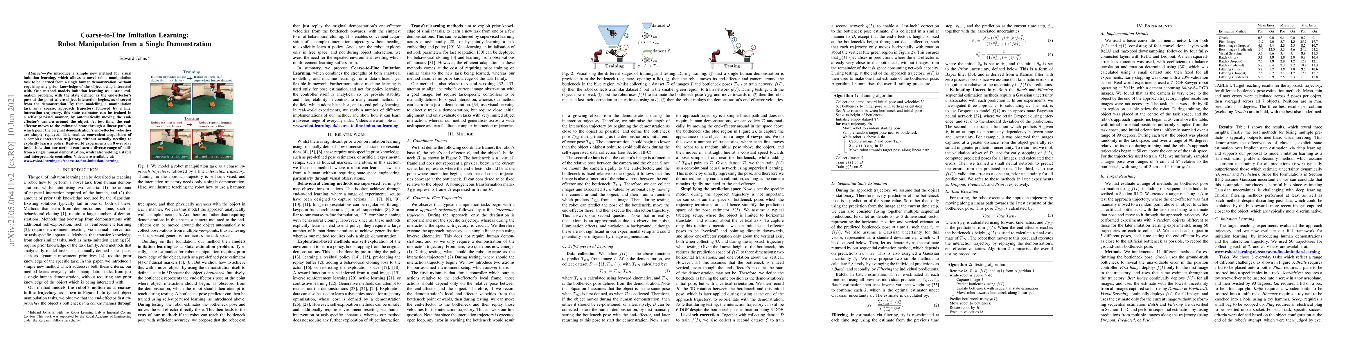 We introduce a simple new method for visual imitation learning, which allows a novel robot manipulation task to be learned from a single human demonstration, without requiring any prior knowledge of the object being interacted with. Our method models imitation learning as a state estimation problem, with the state defined as the end-effector's pose at the point where object interaction begins, as observed from the demonstration. By then modelling a manipulation task as a coarse, approach trajectory followed by a fine, interaction trajectory, this state estimator can be trained in a self-supervised manner, by automatically moving the end-effector's camera around the object. At test time, the end-effector moves to the estimated state through a linear path, at which point the original demonstration's end-effector velocities are simply replayed. This enables convenient acquisition of a complex interaction trajectory, without actually needing to explicitly learn a policy. Real-world experiments on 8 everyday tasks show that our method can learn a diverse range of skills from a single human demonstration, whilst also yielding a stable and interpretable controller.