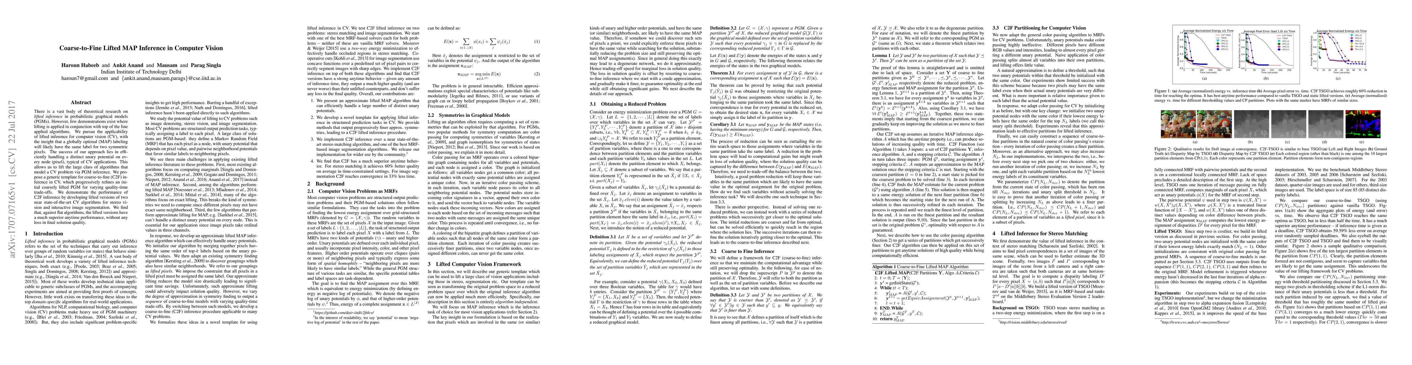 There is a vast body of theoretical research on lifted inference in probabilistic graphical models (PGMs). However, few demonstrations exist where lifting is applied in conjunction with top of the line applied algorithms. We pursue the applicability of lifted inference for computer vision (CV), with the insight that a globally optimal (MAP) labeling will likely have the same label for two symmetric pixels. The success of our approach lies in efficiently handling a distinct unary potential on every node (pixel), typical of CV applications. This allows us to lift the large class of algorithms that model a CV problem via PGM inference. We propose a generic template for coarse-to-fine (C2F) inference in CV, which progressively refines an initial coarsely lifted PGM for varying quality-time trade-offs. We demonstrate the performance of C2F inference by developing lifted versions of two near state-of-the-art CV algorithms for stereo vision and interactive image segmentation. We find that, against flat algorithms, the lifted versions have a much superior anytime performance, without any loss in final solution quality.