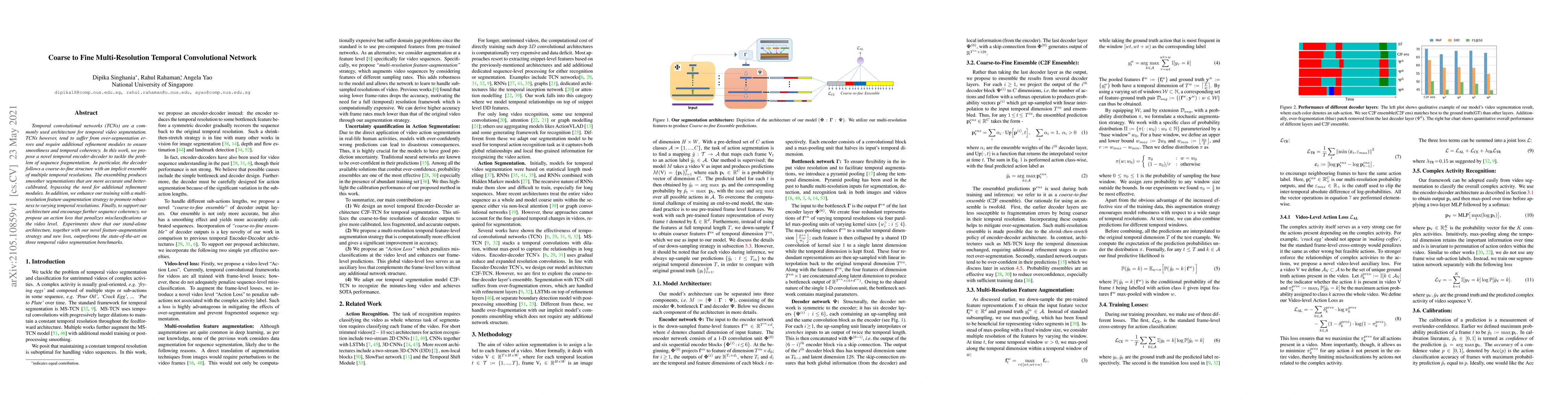 Temporal convolutional networks (TCNs) are a commonly used architecture for temporal video segmentation. TCNs however, tend to suffer from over-segmentation errors and require additional refinement modules to ensure smoothness and temporal coherency. In this work, we propose a novel temporal encoder-decoder to tackle the problem of sequence fragmentation. In particular, the decoder follows a coarse-to-fine structure with an implicit ensemble of multiple temporal resolutions. The ensembling produces smoother segmentations that are more accurate and better-calibrated, bypassing the need for additional refinement modules. In addition, we enhance our training with a multi-resolution feature-augmentation strategy to promote robustness to varying temporal resolutions. Finally, to support our architecture and encourage further sequence coherency, we propose an action loss that penalizes misclassifications at the video level. Experiments show that our stand-alone architecture, together with our novel feature-augmentation strategy and new loss, outperforms the state-of-the-art on three temporal video segmentation benchmarks.