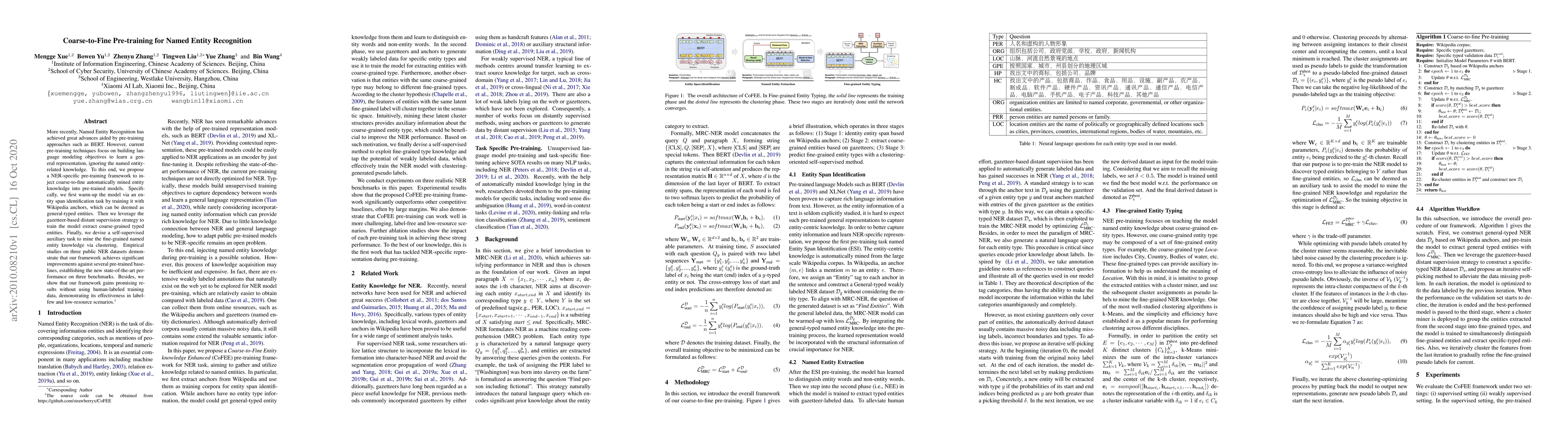 More recently, Named Entity Recognition hasachieved great advances aided by pre-trainingapproaches such as BERT. However, currentpre-training techniques focus on building lan-guage modeling objectives to learn a gen-eral representation, ignoring the named entity-related knowledge. To this end, we proposea NER-specific pre-training framework to in-ject coarse-to-fine automatically mined entityknowledge into pre-trained models. Specifi-cally, we first warm-up the model via an en-tity span identification task by training it withWikipedia anchors, which can be deemed asgeneral-typed entities. Then we leverage thegazetteer-based distant supervision strategy totrain the model extract coarse-grained typedentities. Finally, we devise a self-supervisedauxiliary task to mine the fine-grained namedentity knowledge via clustering.Empiricalstudies on three public NER datasets demon-strate that our framework achieves significantimprovements against several pre-trained base-lines, establishing the new state-of-the-art per-formance on three benchmarks. Besides, weshow that our framework gains promising re-sults without using human-labeled trainingdata, demonstrating its effectiveness in label-few and low-resource scenarios