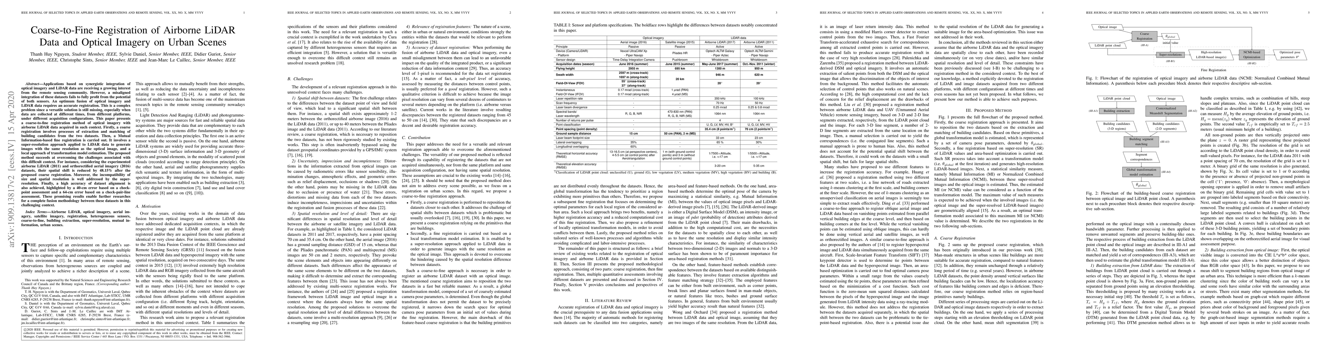 This paper presents a coarse-to-fine registration method for aligning airborne LiDAR data with optical imagery in urban scenes, addressing the challenges of data collected at different times and configurations. The method achieves a 48.15% reduction in spatial shift and high accuracy with errors of 40 cm and 64 cm, respectively.