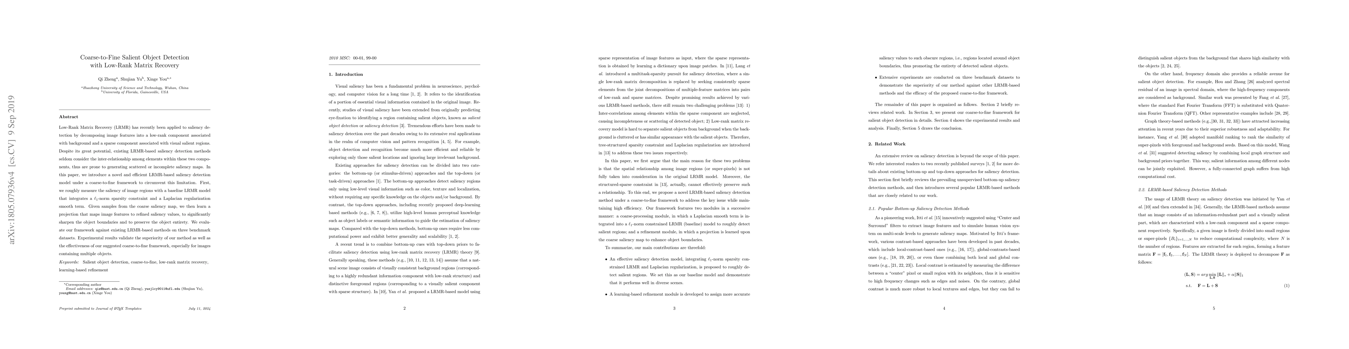 This paper proposes a novel coarse-to-fine salient object detection model using Low-Rank Matrix Recovery (LRMR) that integrates a $\ell_1$-norm sparsity constraint and Laplacian regularization. The method first generates a rough saliency map and then refines it to sharpen object boundaries and preserve object entirety, outperforming existing LRMR-based methods on benchmark datasets.