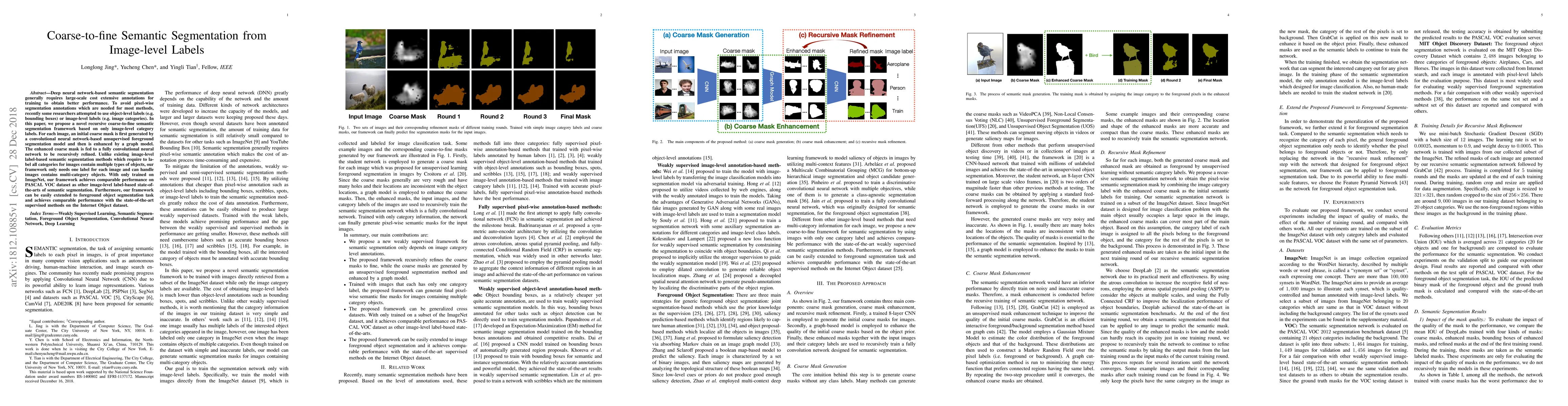 This paper proposes a novel coarse-to-fine semantic segmentation framework that uses only image-level labels for training, avoiding the need for costly pixel-wise annotations. The method achieves comparable performance on the PASCAL VOC dataset and can handle multi-category objects with a single label per image.