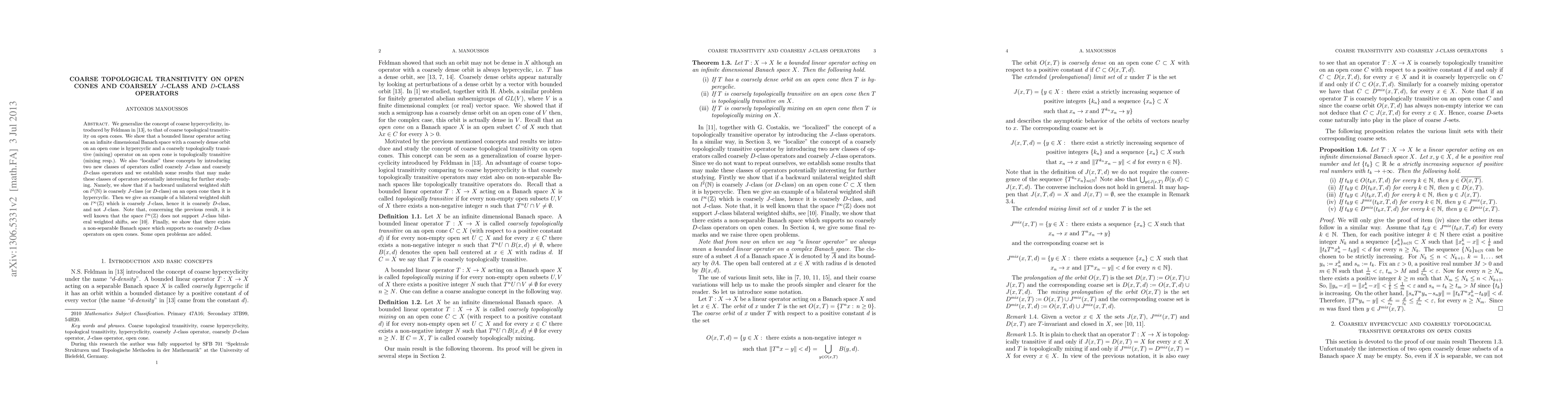 This paper generalizes the concept of coarse hypercyclicity to coarse topological transitivity on open cones in infinite-dimensional Banach spaces, introducing coarsely $J$-class and $D$-class operators. It demonstrates that certain operators are hypercyclic and establishes that coarsely $D$-class operators on open cones are topologically transitive.