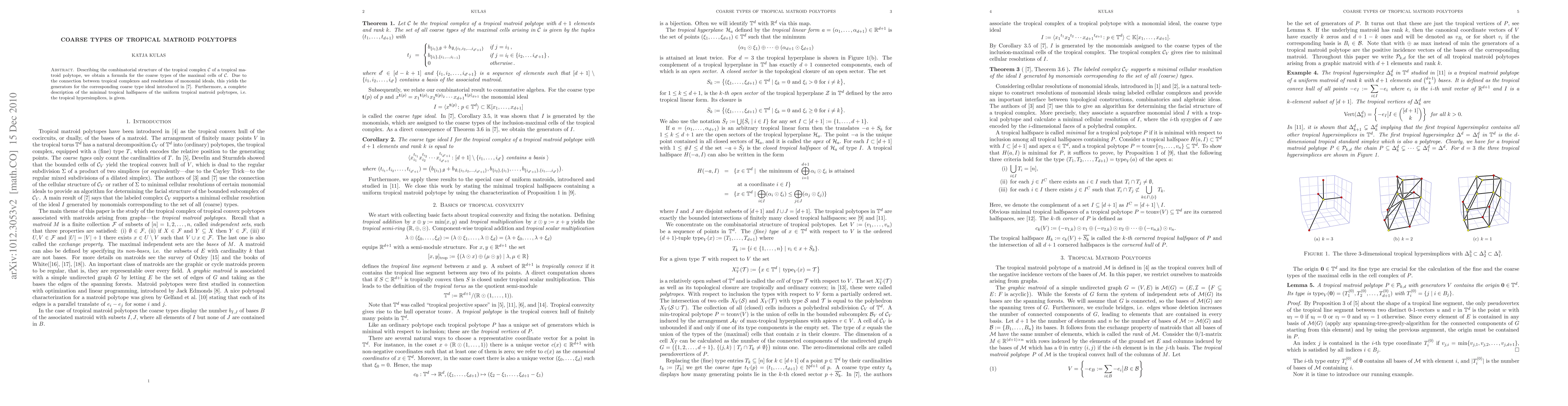 Describing the combinatorial structure of the tropical complex $C$ of a tropical matroid polytope, we obtain a formula for the coarse types of the maximal cells of $C$. Due to the connection between tropical complexes and resolutions of monomial ideals, this yields the generators for the corresponding coarse type ideal introduced in a recent paper of Dochtermann, Joswig and Sanyal (2010, preprint arXiv.org:1001.0237). Furthermore, a complete description of the minimal tropical halfspaces of the uniform tropical matroid polytopes, i.e. the tropical hypersimplices, is given.