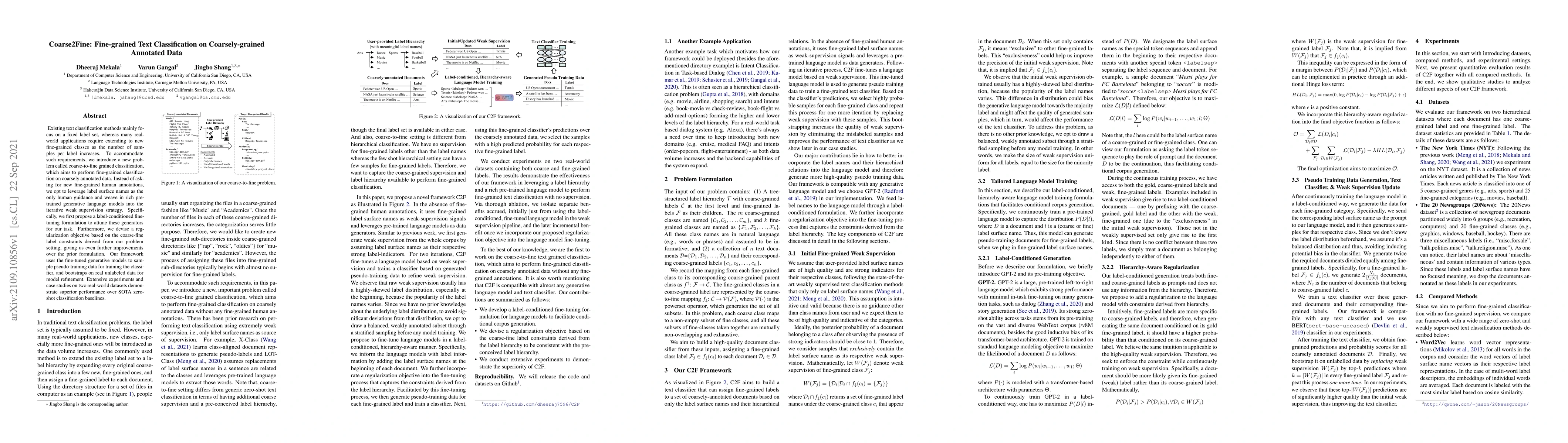 The paper introduces a method for fine-grained text classification using coarsely annotated data, leveraging pre-trained generative models and iterative weak supervision to extend classification without new fine-grained annotations. The proposed framework achieves superior performance compared to state-of-the-art zero-shot classification baselines.