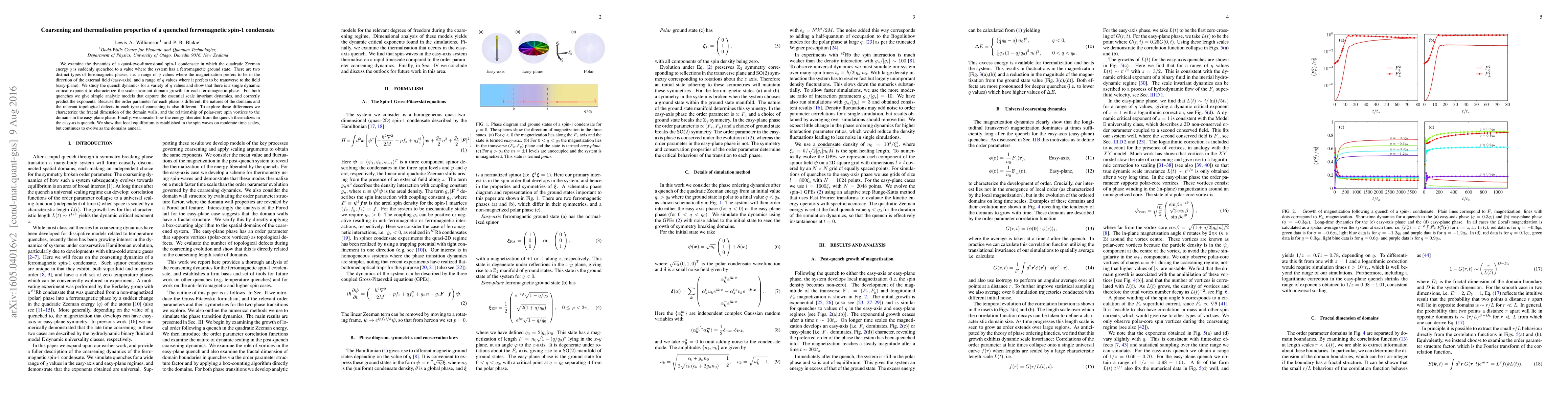 This paper investigates the dynamics of a quenched ferromagnetic spin-1 condensate, revealing distinct phase behaviors and a single critical exponent for domain growth in each phase. It explores the differences in domain structures and thermalization processes, showing that local equilibrium is achieved in spin waves after moderate time scales.