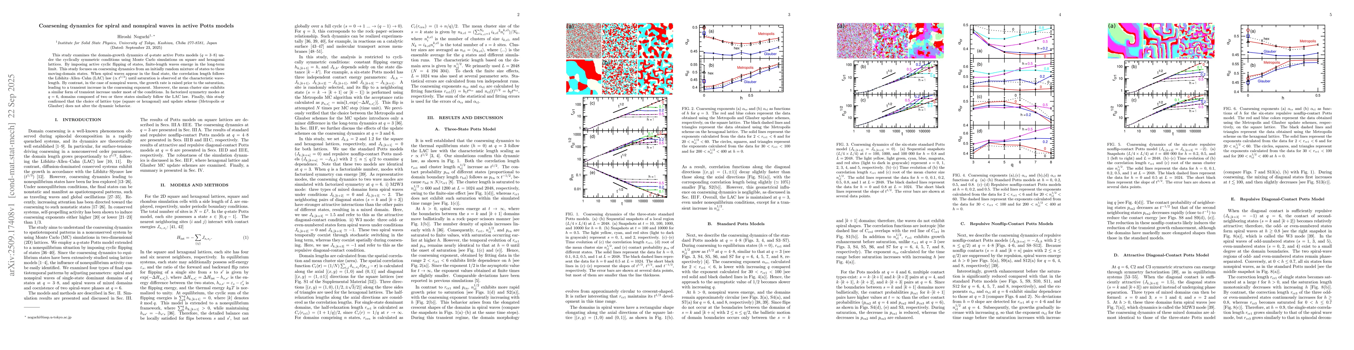 This research advances understanding of pattern formation in active Potts models, providing insights into how different wave types (spiral vs nonspiral) influence coarsening dynamics under nonequilibrium conditions.