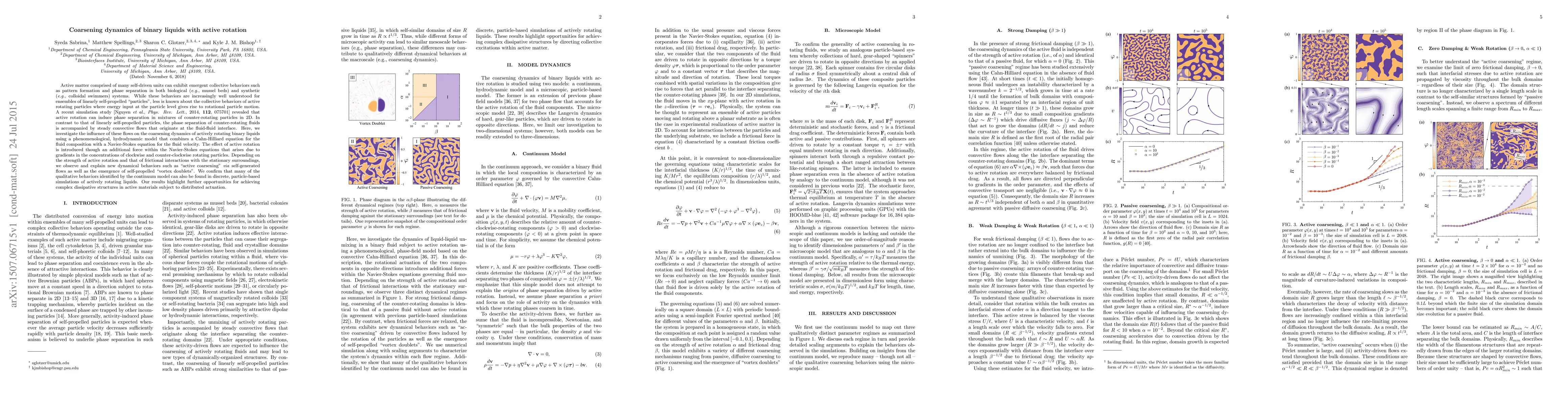 Active matter comprised of many self-driven units can exhibit emergent collective behaviors such as pattern formation and phase separation in both biologica and synthetic systems. While these behaviors are increasingly well understood for ensembles of linearly self-propelled particles, less is known about the collective behaviors of active rotating particles where energy input at the particle level gives rise to rotational particle motion. A recent simulation study revealed that active rotation can induce phase separation in mixtures of counter-rotating particles in 2D. In contrast to that of linearly self-propelled particles, the phase separation of counter-rotating fluids is accompanied by steady convective flows that originate at the fluid-fluid interface. Here, we investigate the influence of these flows on the coarsening dynamics of actively rotating binary liquids using a phenomenological, hydrodynamic model that combines a Cahn-Hilliard equation for the fluid composition with a Navier-Stokes equation for the fluid velocity. The effect of active rotation is introduced though an additional force within the Navier-Stokes equations that arises due to gradients in the concentrations of clockwise and counter-clockwise rotating particles. Depending on the strength of active rotation and that of frictional interactions with the stationary surroundings, we observe and explain new dynamical behaviors such as "active coarsening" via self-generated flows as well as the emergence of self-propelled vortex doublets. We confirm that many of the qualitative behaviors identified by the continuum model can also be found in discrete, particle-based simulations of actively rotating liquids. Our results highlight further opportunities for achieving complex dissipative structures in active materials subject to distributed actuation.