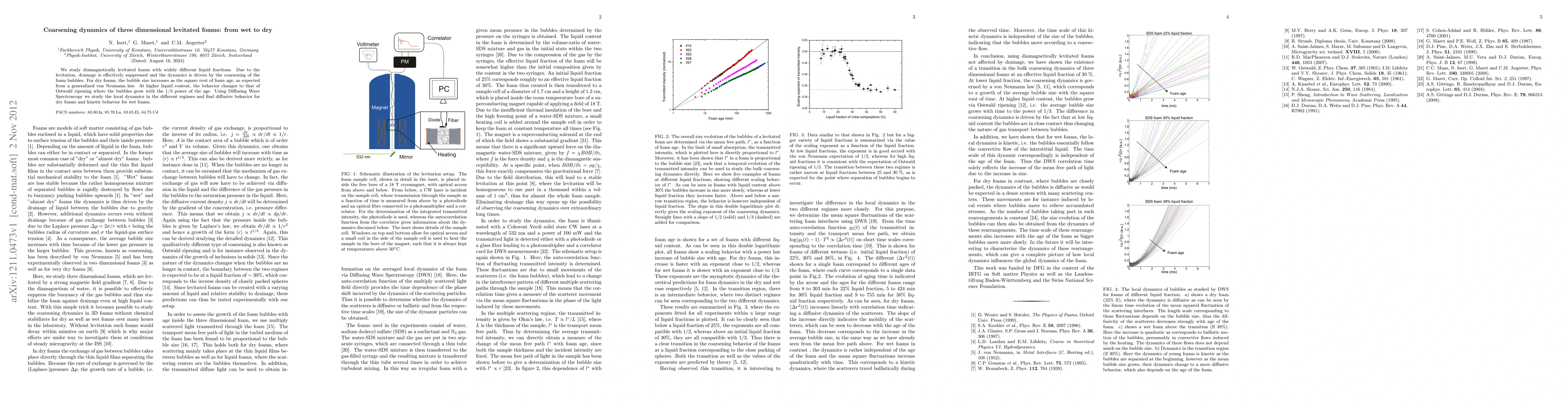 This study investigates the coarsening dynamics of diamagnetically levitated foams with varying liquid fractions, revealing a transition from bubble size growth proportional to the square root of time in dry foams to a 1/3 power relationship in wet foams. Diffusing Wave Spectroscopy shows diffusive dynamics in dry foams and kinetic behavior in wet foams.