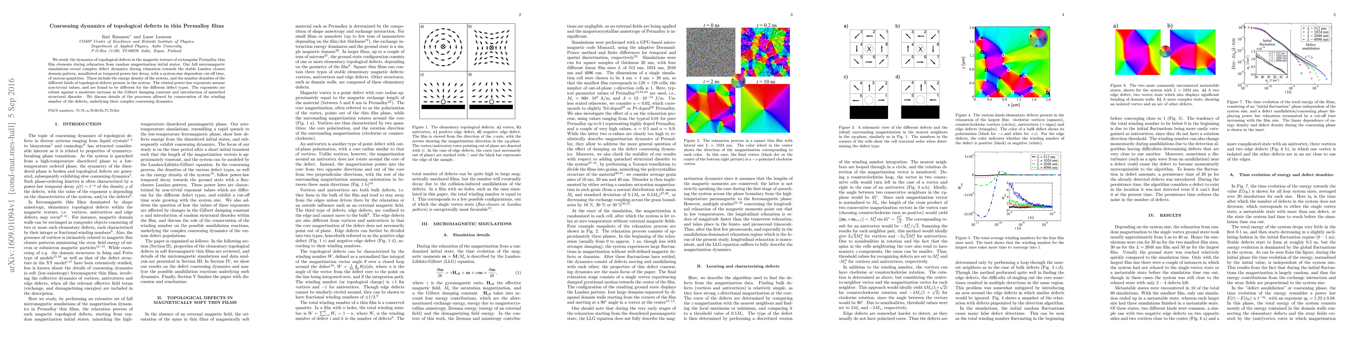 This paper investigates the relaxation dynamics of topological defects in Permalloy thin films, revealing complex coarsening behaviors through micromagnetic simulations. The study finds that defect decay follows power-law patterns with system-size-dependent cut-off times, and the exponents vary by defect type, remaining robust against changes in damping and disorder.
