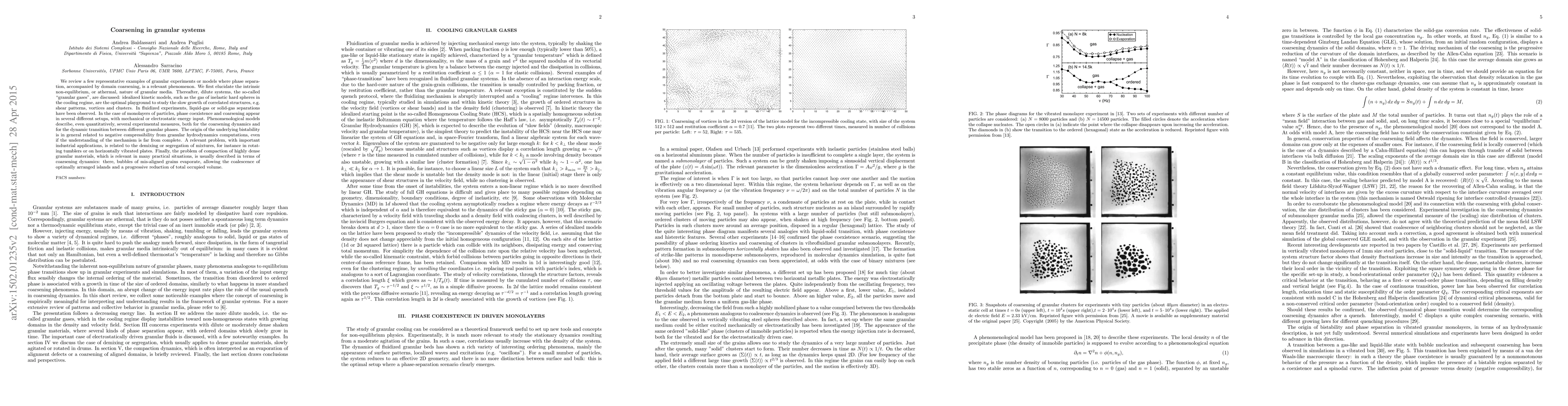 This paper reviews granular systems where phase separation and coarsening occur, highlighting the non-equilibrium nature of granular media. It discusses dilute granular gases, fluidized experiments, and monolayers, emphasizing the role of negative compressibility and the segregation of mixtures, with applications in compaction and industrial processes.