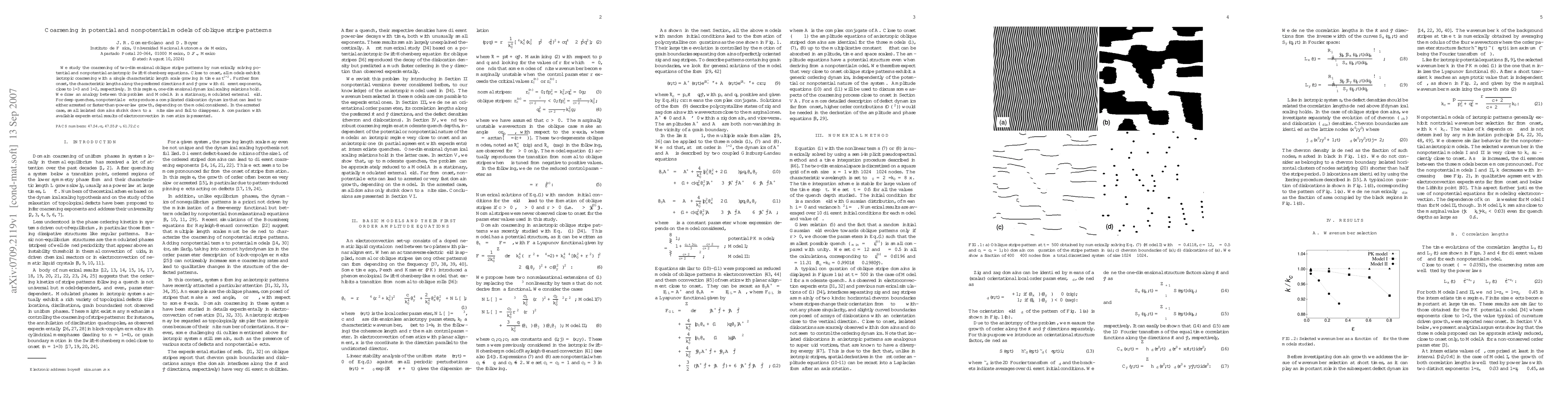 This paper investigates the coarsening behavior of two-dimensional oblique stripe patterns using potential and nonpotential anisotropic Swift-Hohenberg equations, revealing different scaling regimes and dynamics, including arrested growth due to dislocation dynamics in nonpotential models. Experimental results from electroconvection in nematics are compared.
