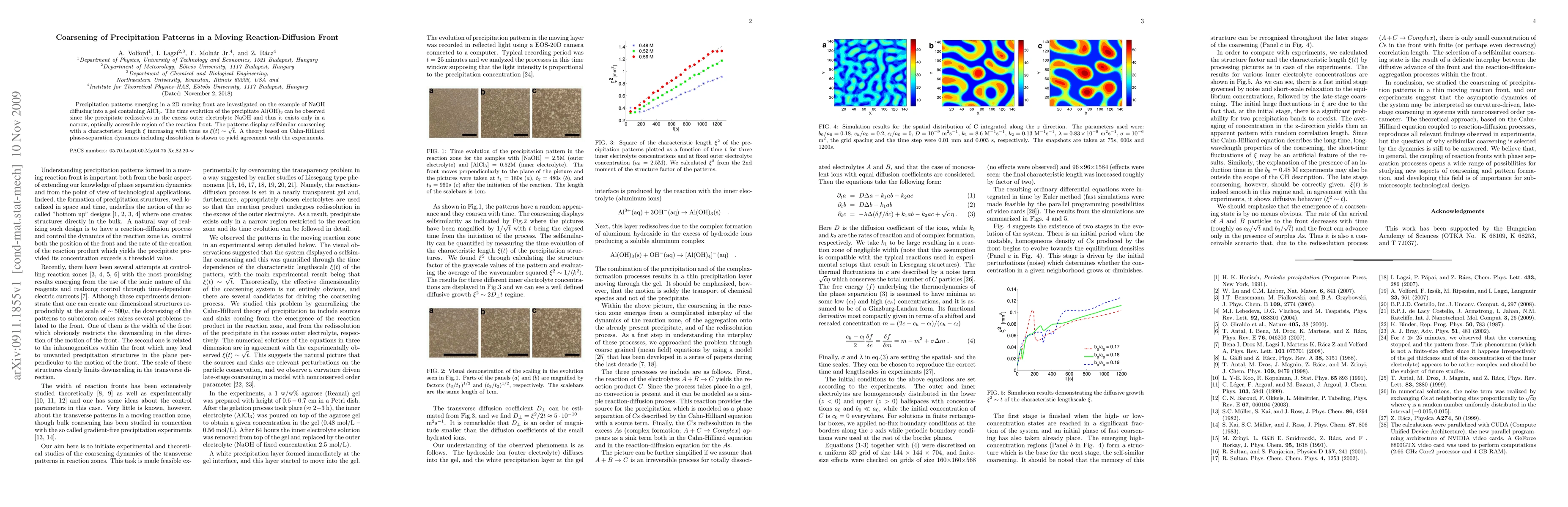 Researchers observed self-similar coarsening of precipitation patterns in a moving reaction front, with characteristic length increasing like the square root of time. A Cahn-Hilliard theory based on dissolution agrees with the experiment results.