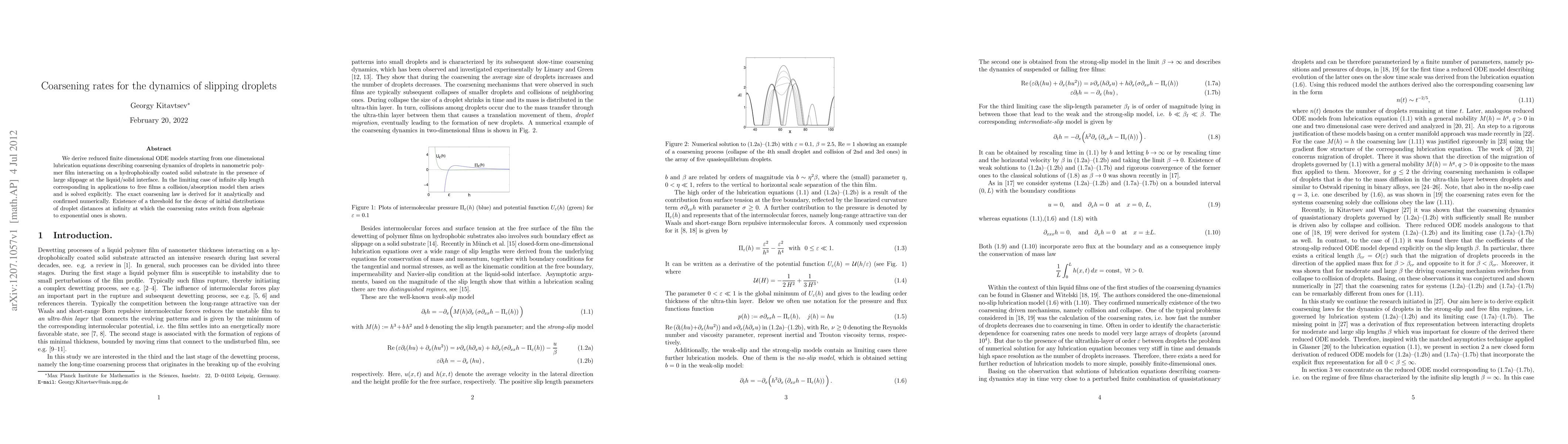 Researchers developed models to study how droplets coarsen in nanometric polymer films on hydrophobic substrates with large slippage, revealing a threshold for coarsening rates that switches between algebraic and exponential decay.