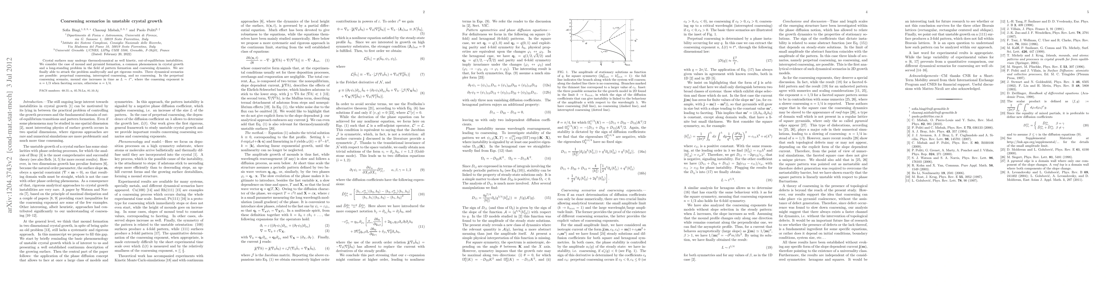 This paper analyzes thermodynamical and kinetic instabilities in crystal growth, focusing on mound and pyramid formation. It identifies three dynamical coarsening scenarios: perpetual, interrupted, and no coarsening, with the perpetual coarsening showing mound size growth as L=t^n, where n=1/3 with faceting and n=1/4 without.