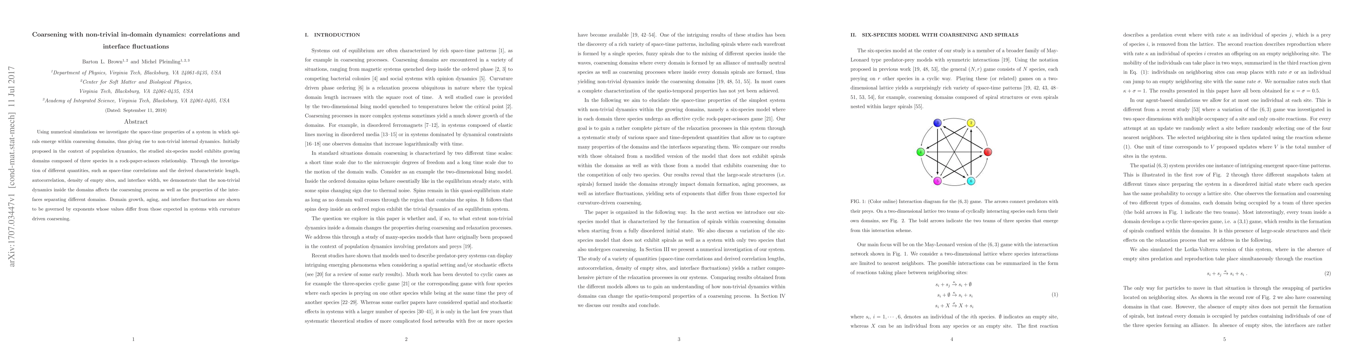 This paper uses numerical simulations to explore a six-species model where spirals emerge within coarsening domains, leading to complex internal dynamics. The study reveals that these internal dynamics significantly influence the coarsening process and the properties of domain interfaces, with growth, aging, and fluctuations exhibiting different scaling exponents compared to traditional models.