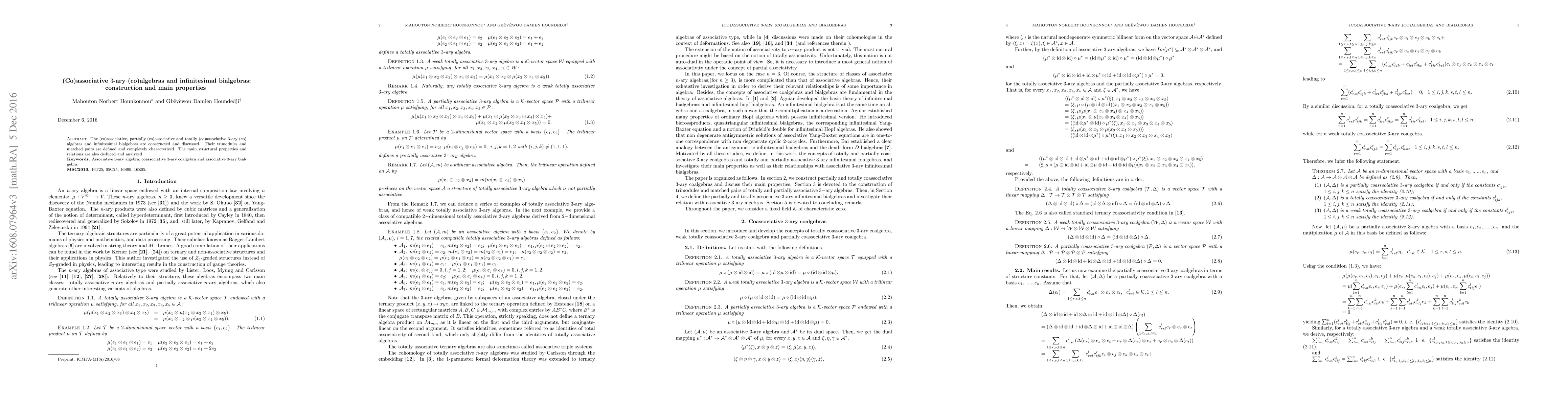 The (co)associative, partially (co)associative and totally (co)associative $3$-ary (co) algebras and infinitesimal bialgebras are constructed and discussed. Their trimodules and matched pairs are defined and completely characterized. The main structural properties and relations are also deduced and analyzed.