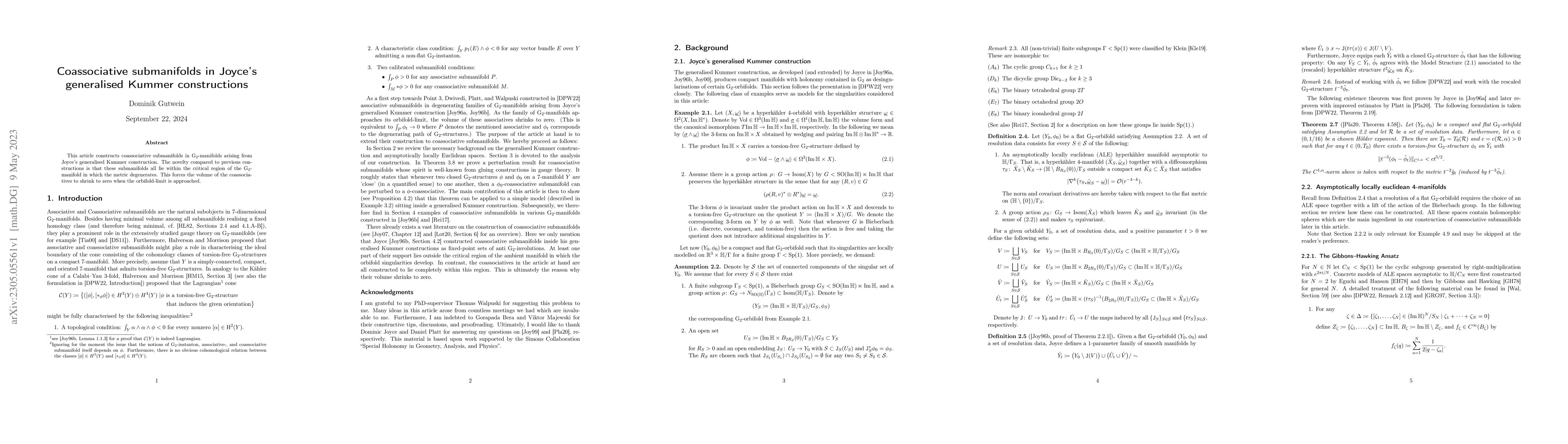 This paper constructs coassociative submanifolds in $G_2$-manifolds from Joyce's generalised Kummer construction, noting that these submanifolds reside in the critical region where the metric degenerates, causing their volume to shrink to zero as the orbifold-limit is approached.