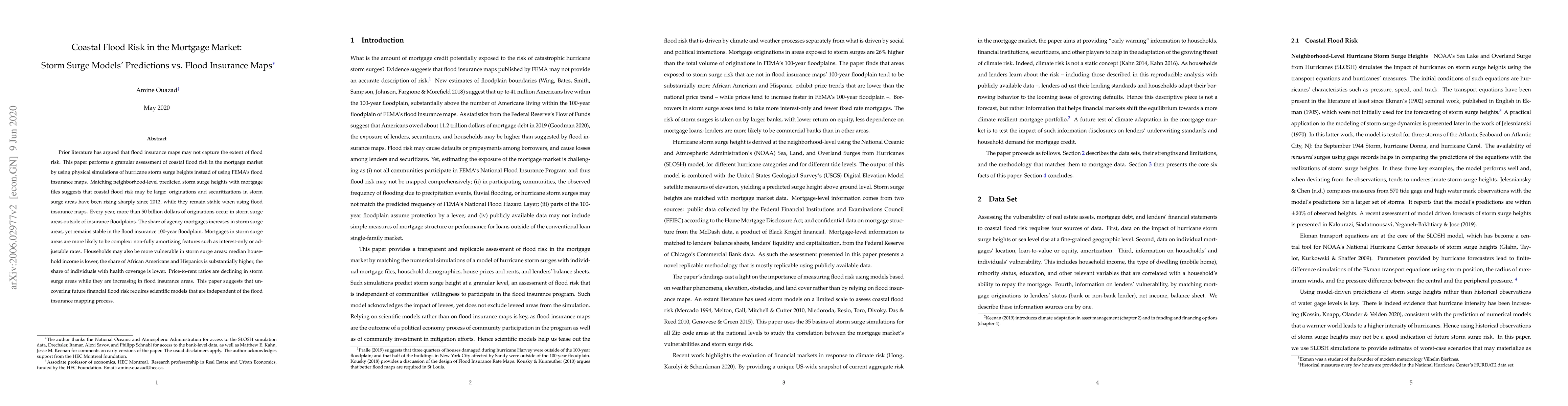 Prior literature has argued that flood insurance maps may not capture the extent of flood risk. This paper performs a granular assessment of coastal flood risk in the mortgage market by using physical simulations of hurricane storm surge heights instead of using FEMA's flood insurance maps. Matching neighborhood-level predicted storm surge heights with mortgage files suggests that coastal flood risk may be large: originations and securitizations in storm surge areas have been rising sharply since 2012, while they remain stable when using flood insurance maps. Every year, more than 50 billion dollars of originations occur in storm surge areas outside of insurance floodplains. The share of agency mortgages increases in storm surge areas, yet remains stable in the flood insurance 100-year floodplain. Mortgages in storm surge areas are more likely to be complex: non-fully amortizing features such as interest-only or adjustable rates. Households may also be more vulnerable in storm surge areas: median household income is lower, the share of African Americans and Hispanics is substantially higher, the share of individuals with health coverage is lower. Price-to-rent ratios are declining in storm surge areas while they are increasing in flood insurance areas. This paper suggests that uncovering future financial flood risk requires scientific models that are independent of the flood insurance mapping process.
