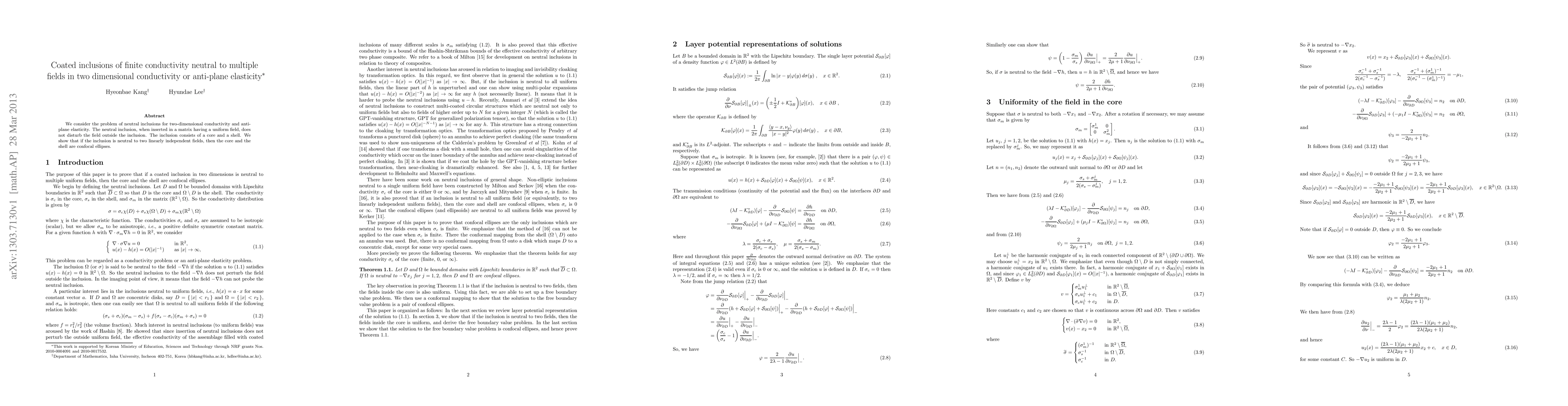 This paper examines coated inclusions that do not disturb uniform fields in two-dimensional conductivity or anti-plane elasticity, demonstrating that such neutral inclusions consist of core and shell that are confocal ellipses when neutral to two independent fields.
