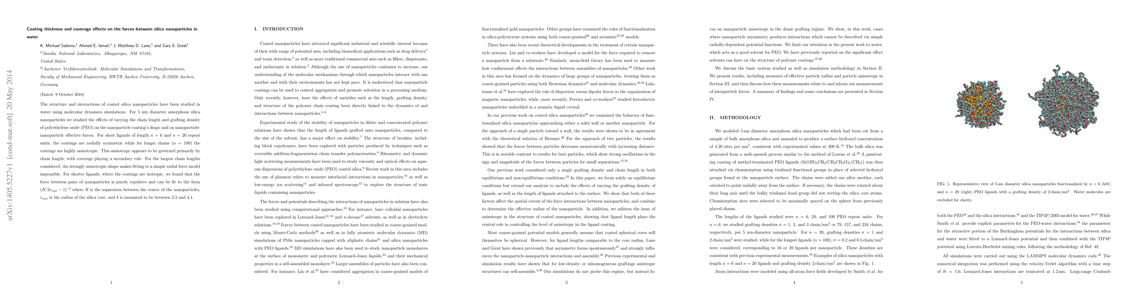 The structure and interactions of coated silica nanoparticles have been studied in water using molecular dynamics simulations. For 5 nm diameter amorphous silica nanoparticles we studied the effects of varying the chain length and grafting density of polyethylene oxide (PEO) on the nanoparticle coating's shape and on nanoparticle-nanoparticle effective forces. For short ligands of length $n=6$ and $n=20$ repeat units, the coatings are radially symmetric while for longer chains ($n=100$) the coatings are highly anisotropic. This anisotropy appears to be governed primarily by chain length, with coverage playing a secondary role. For the largest chain lengths considered, the strongly anisotropic shape makes fitting to a simple radial force model impossible. For shorter ligands, where the coatings are isotropic, we found that the force between pairs of nanoparticles is purely repulsive and can be fit to the form $(R/2r_\text{core}-1)^{-b}$ where $R$ is the separation between the center of the nanoparticles, $r_\text{core}$ is the radius of the silica core, and $b$ is measured to be between 2.3 and 4.1.