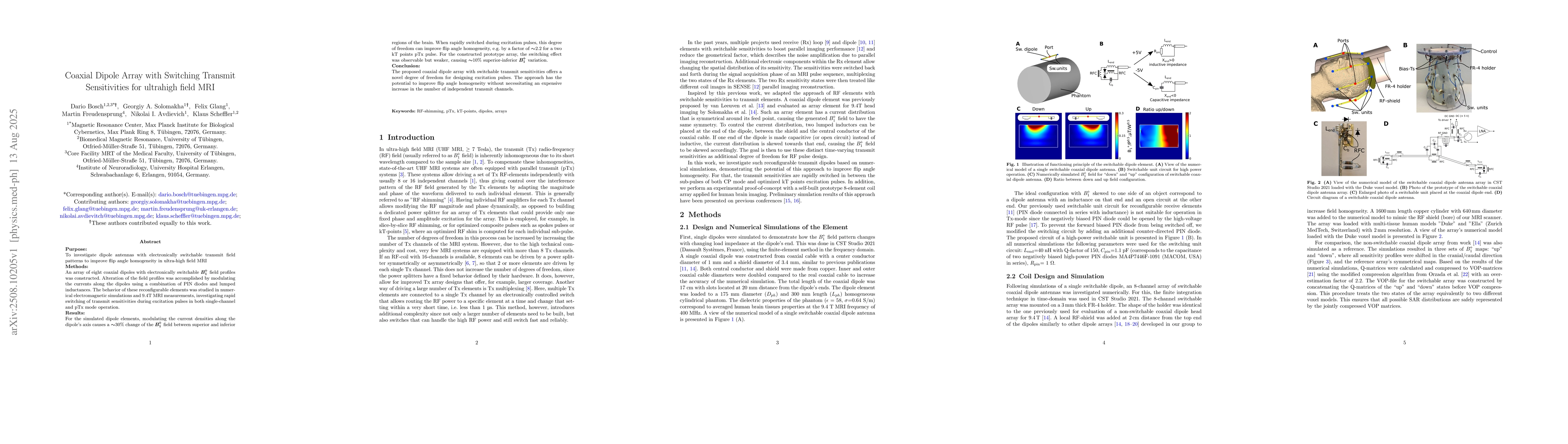 Purpose: To investigate dipole antennas with electronically switchable transmit field patterns to improve flip angle homogeneity in ultra-high field MRI Methods: An array of eight coaxial dipoles with electronically switchable $B_{1}^{\!+}$ field profiles was constructed. Alteration of the field profiles was accomplished by modulating the currents along the dipoles using a combination of PIN diodes and lumped inductances. The behavior of these reconfigurable elements was studied in numerical electromagnetic simulations and 9.4T MRI measurements, investigating rapid switching of transmit sensitivities during excitation pulses in both single-channel and pTx mode operation. Results: For the simulated dipole elements, modulating the current densities along the dipole's axis causes a $\sim$30% change of the $B_{1}^{\!+}$ field between superior and inferior regions of the brain. When rapidly switched during excitation pulses, this degree of freedom can improve flip angle homogeneity, e.g. by a factor of $\sim$2.2 for a two kT points pTx pulse. For the constructed prototype array, the switching effect was observable but weaker, causing $\sim$10% superior-inferior $B_{1}^{\!+}$ variation. Conclusion: The proposed coaxial dipole array with switchable transmit sensitivities offers a novel degree of freedom for designing excitation pulses. The approach has the potential to improve flip angle homogeneity without necessitating an expensive increase in the number of independent transmit channels.