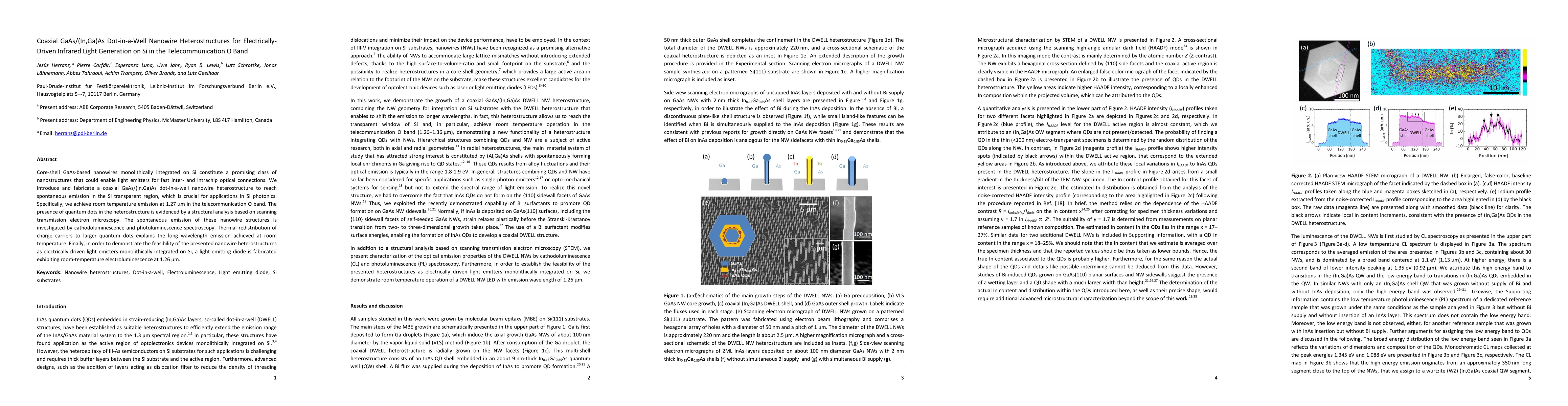 This paper introduces a novel coaxial GaAs/(In,Ga)As dot-in-a-well nanowire heterostructure for room-temperature infrared light generation at 1.27 μm in the telecommunication O band, enabling fast optical connections on Si. The structure demonstrates successful room-temperature electroluminescence, proving its potential as an electrically driven light emitter for Si photonics.
