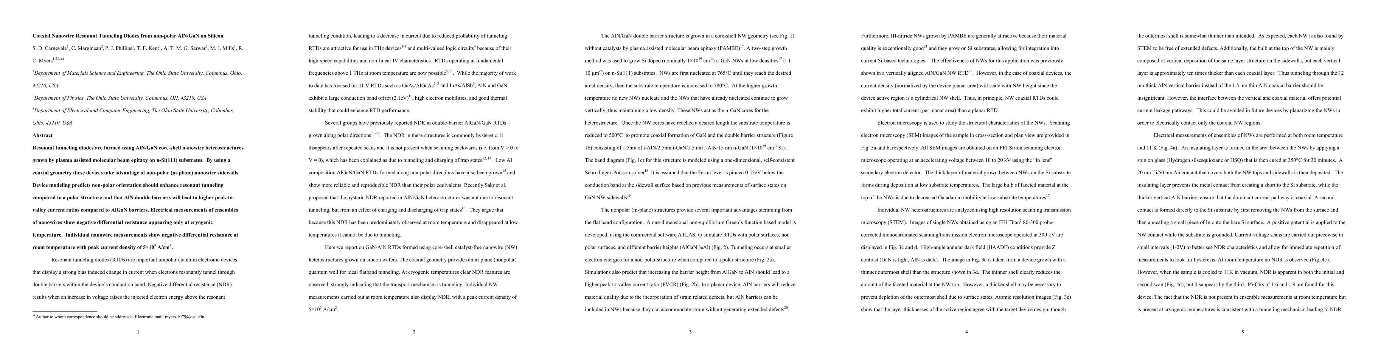 This study reports on resonant tunneling diodes created from non-polar AlN/GaN coaxial nanowires grown on silicon substrates, achieving enhanced resonant tunneling compared to polar structures. Devices demonstrate negative differential resistance at room temperature with high peak current densities.