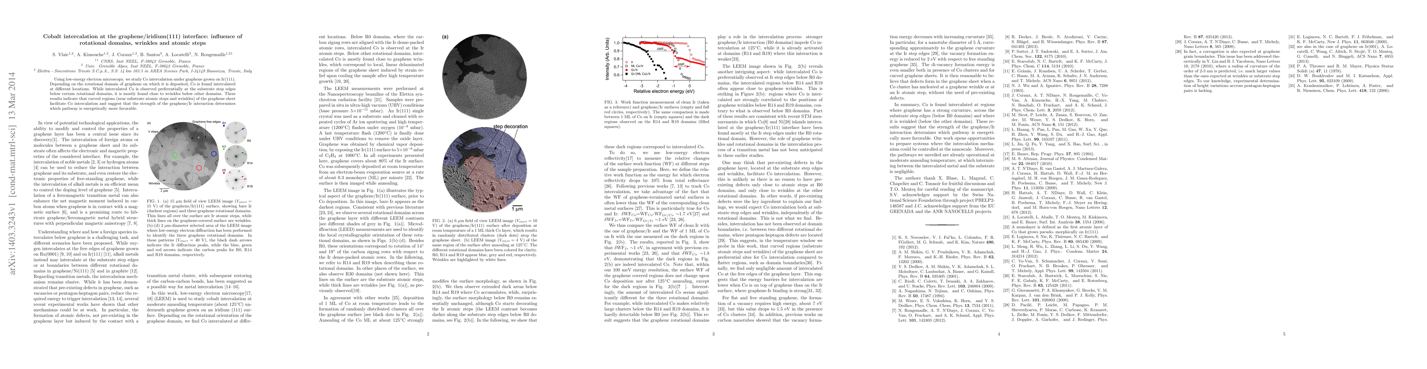 Summary: This study reveals that cobalt intercalation under graphene on Ir(111) varies with the rotational domain of graphene, showing preference for intercalation at substrate step edges or near wrinkles, indicating that curved regions influence intercalation pathways, with the strength of graphene/Ir interaction dictating the favored pathway.