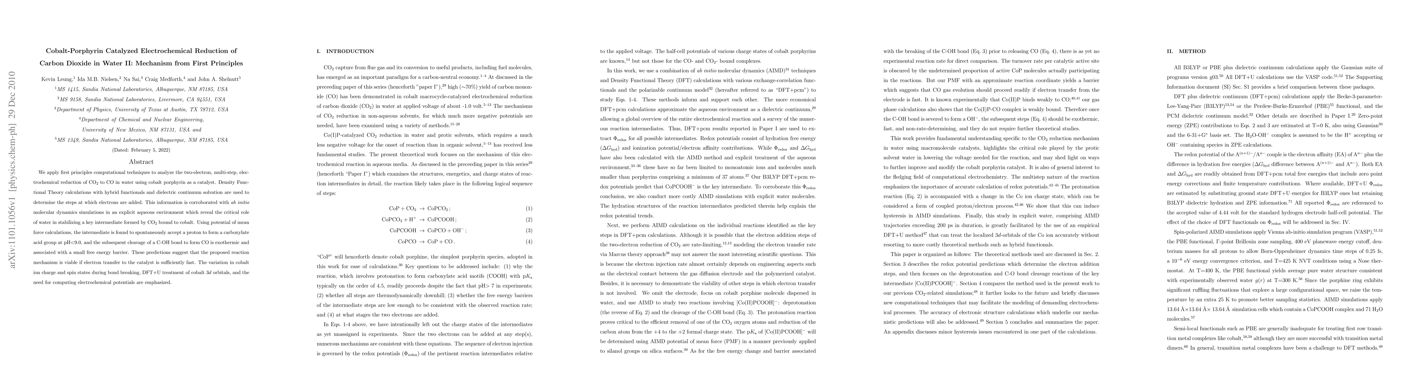 We apply first principles computational techniques to analyze the two-electron, multi-step, electrochemical reduction of CO2 to CO in water using cobalt porphyrin as a catalyst. Density Functional Theory calculations with hybrid functionals and dielectric continuum solvation are used to determine the steps at which electrons are added. This information is corroborated with ab initio molecular dynamics simulations in an explicit aqueous environment which reveal the critical role of water in stabilizing a key intermediate formed by CO2 bound to cobalt. Using potential of mean force calculations, the intermediate is found to spontaneously accept a proton to form a carboxylate acid group at pH<9.0, and the subsequent cleavage of a C-OH bond to form CO is exothermic and associated with a small free energy barrier. These predictions suggest that the proposed reaction mechanism is viable if electron transfer to the catalyst is sufficiently fast. The variation in cobalt ion charge and spin states during bond breaking, DFT+U treatment of cobalt 3d orbitals, and the need for computing electrochemical potentials are emphasized.