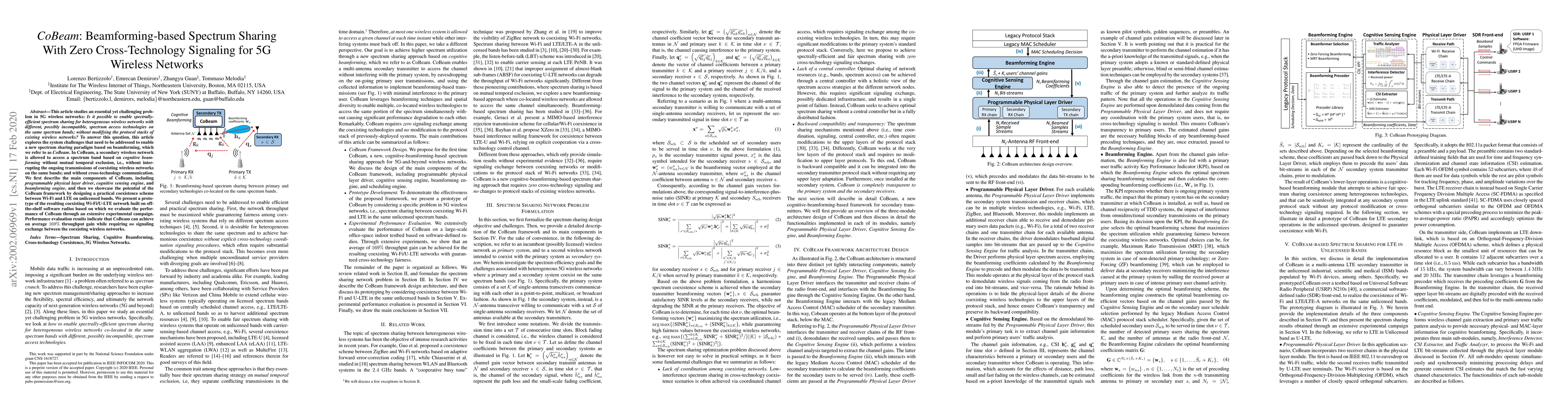 This article studies an essential yet challenging problem in 5G wireless networks: \emph{Is it possible to enable spectrally-efficient spectrum sharing for heterogeneous wireless networks with different, possibly incompatible, spectrum access technologies on the same spectrum bands; without modifying the protocol stacks of existing wireless networks?} To answer this question, this article explores the system challenges that need to be addressed to enable a new spectrum sharing paradigm based on beamforming, which we refer to as {\em CoBeam}. In CoBeam, a secondary wireless network is allowed to access a spectrum band based on {\em cognitive beamforming} without mutual temporal exclusion, i.e., without interrupting the ongoing transmissions of coexisting wireless networks on the same bands; and without cross-technology communication. We first describe the main components of CoBeam, including \emph{programmable physical layer driver}, \emph{cognitive sensing engine}, and \emph{beamforming engine}, and then we showcase the potential of the CoBeam framework by designing a practical coexistence scheme between Wi-Fi and LTE on unlicensed bands. We present a prototype of the resulting coexisting Wi-Fi/U-LTE network built on off-the-shelf software radios based on which we evaluate the performance of CoBeam through an extensive experimental campaign. Performance evaluation results indicate that CoBeam can achieve on average $169\%$ throughput gain while requiring \emph{no} signaling exchange between the coexisting wireless networks.