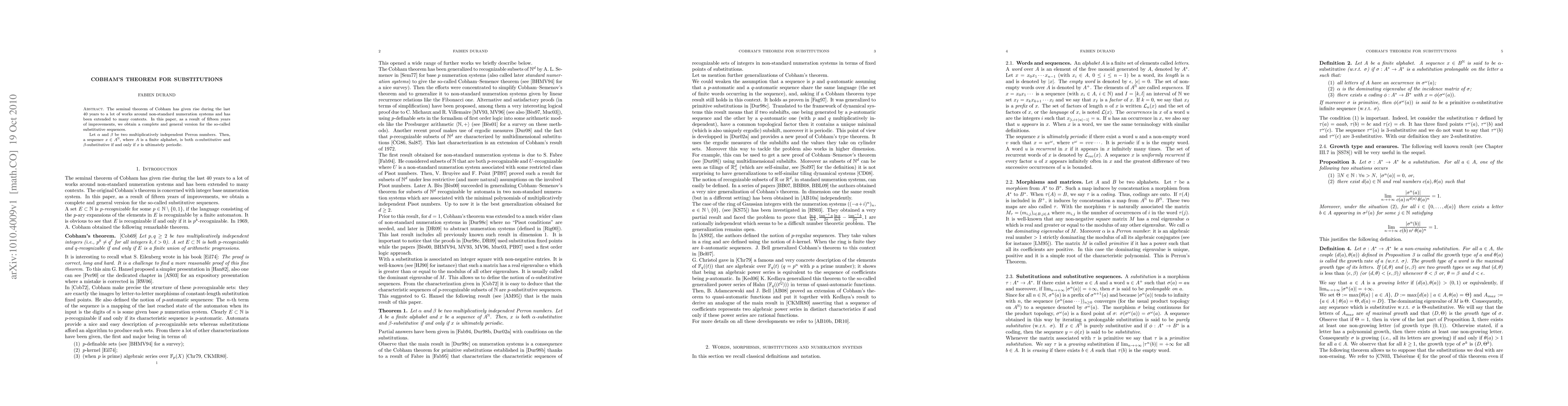 This paper presents a comprehensive version of Cobham's theorem, focusing on substitutive sequences. It establishes that a sequence is simultaneously $alpha$-substitutive and $eta$-substitutive, where $alpha$ and $eta$ are multiplicatively independent Perron numbers, if and only if the sequence is ultimately periodic.