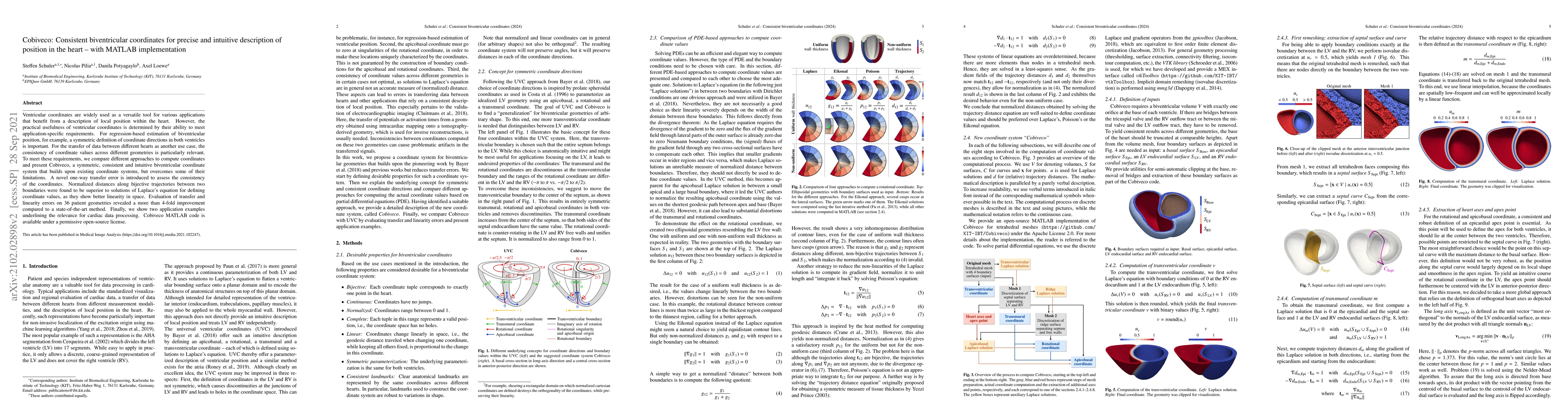 Ventricular coordinates are widely used as a versatile tool for various applications that benefit from a description of local position within the heart. However, the practical usefulness of ventricular coordinates is determined by their ability to meet application-specific requirements. For regression-based estimation of biventricular position, for example, a symmetric definition of coordinate directions in both ventricles is important. For the transfer of data between different hearts as another use case, the consistency of coordinate values across different geometries is particularly relevant. To meet these requirements, we compare different approaches to compute coordinates and present Cobiveco, a symmetric, consistent and intuitive biventricular coordinate system that builds upon existing coordinate systems, but overcomes some of their limitations. A novel one-way transfer error is introduced to assess the consistency of the coordinates. Normalized distances along bijective trajectories between two boundaries were found to be superior to solutions of Laplace's equation for defining coordinate values, as they show better linearity in space. Evaluation of transfer and linearity errors on 36 patient geometries revealed a more than 4-fold improvement compared to a state-of-the-art method. Finally, we show two application examples underlining the relevance for cardiac data processing. Cobiveco MATLAB code is available under a permissive open-source license.