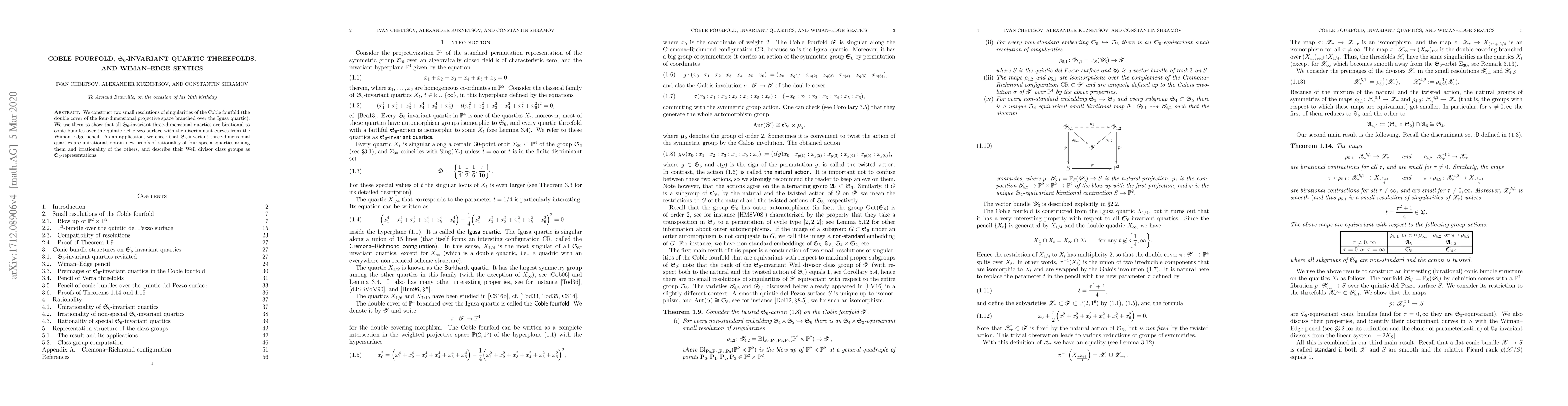 We construct two small resolutions of singularities of the Coble fourfold (the double cover of the four-dimensional projective space branched over the Igusa quartic). We use them to show that all $S_6$-invariant three-dimensional quartics are birational to conic bundles over the quintic del Pezzo surface with the discriminant curves from the Wiman-Edge pencil. As an application, we check that $S_6$-invariant three-dimensional quartics are unirational, obtain new proofs of rationality of four special quartics among them and irrationality of the others, and describe their Weil divisor class groups as $S_6$-representations.