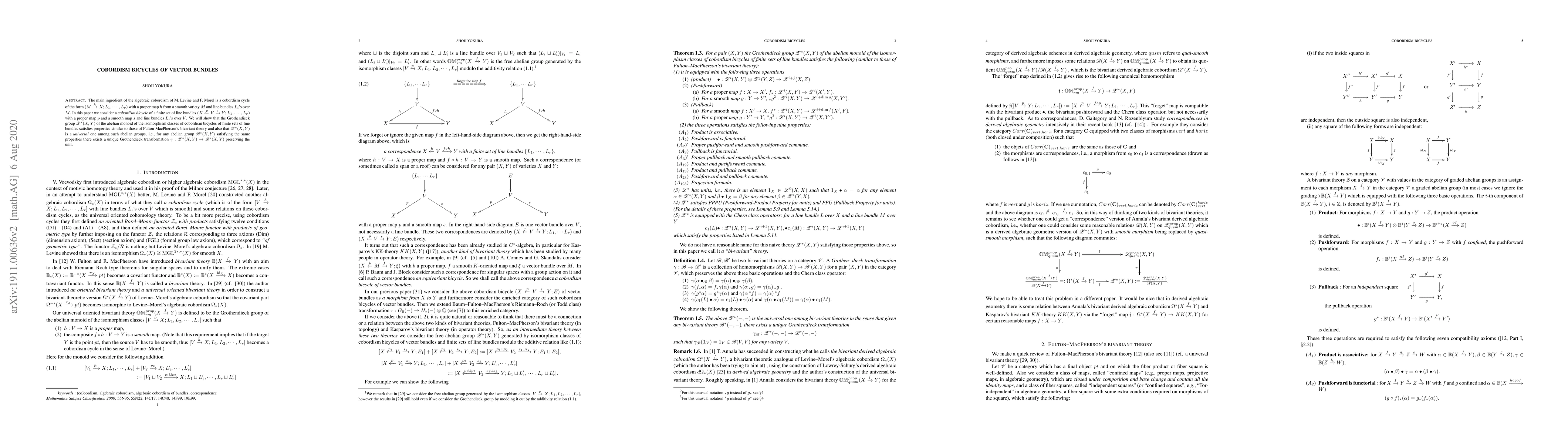 This paper explores cobordism bicycles of vector bundles, defined as configurations involving line bundles over a variety with proper and smooth maps. It establishes that the Grothendieck group $\mathscr Z^*(X, Y)$ of these bicycles shares properties with Fulton-MacPherson's bivariant theory and is universal among such abelian groups.