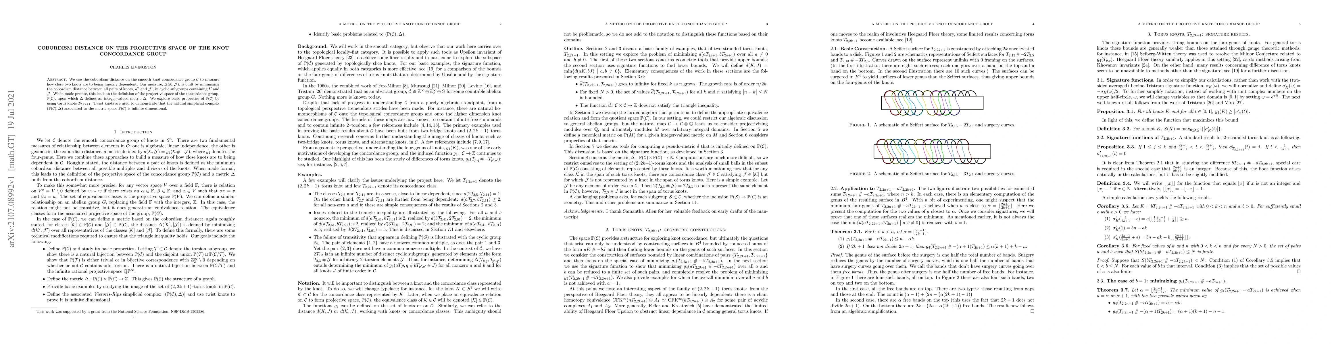 The cobordism distance on the knot concordance group is used to define a measure of how close two knots are to being linearly dependent. Roughly stated, d(K,J) is defined by minimizing the cobordism distance between pairs of knots in cyclic subgroups containing K and J. When made precise, this leads to the definition of the projective space of the knot concordance group. We explore basic properties of this projective space and its integer-valued metric by considering torus knots. Twist knots are used to show that the associated simplicial complex contains an infinite set of simplices of arbitrarily large dimension.