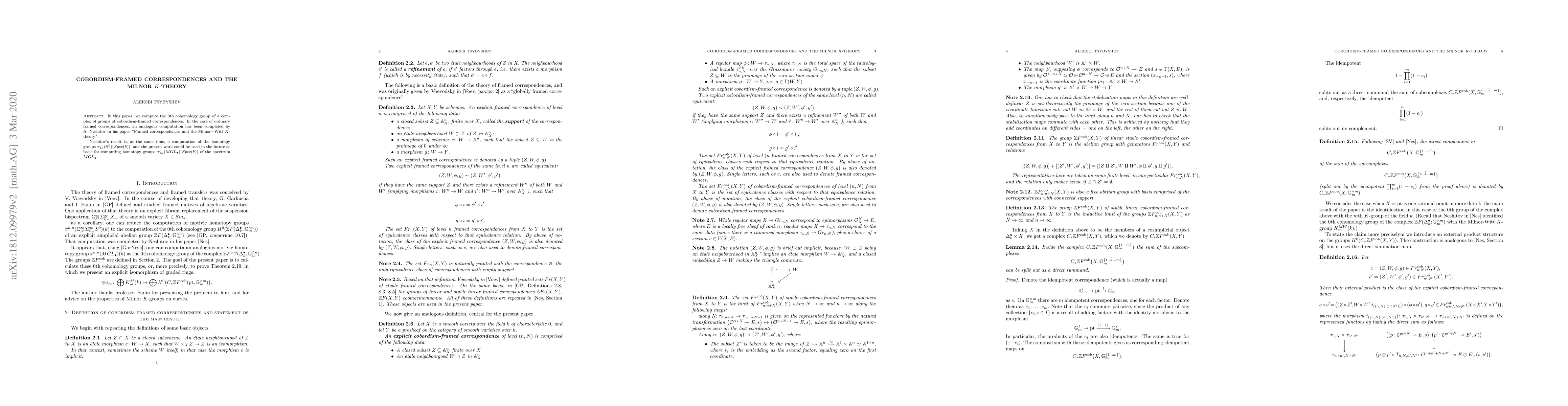 In this work, we compute the $0$th cohomology group of a complex of groups of cobordism-framed correspondences, and prove the isomorphism to Milnor $K$-groups. An analogous result for common framed correspondences has been proved by A. Neshitov in his paper "Framed correspondences and the Milnor---Witt $K$-theory". Neshitov's result is, at the same time, a computation of the homotopy groups $\pi_{i,i}(S^0)(Spec(k)).$ This work could be used in the future as basis for computing homotopy groups $\pi_{i,i}(MGL_{\bullet})(Spec(k))$ of the spectrum $MGL_{\bullet}.$
