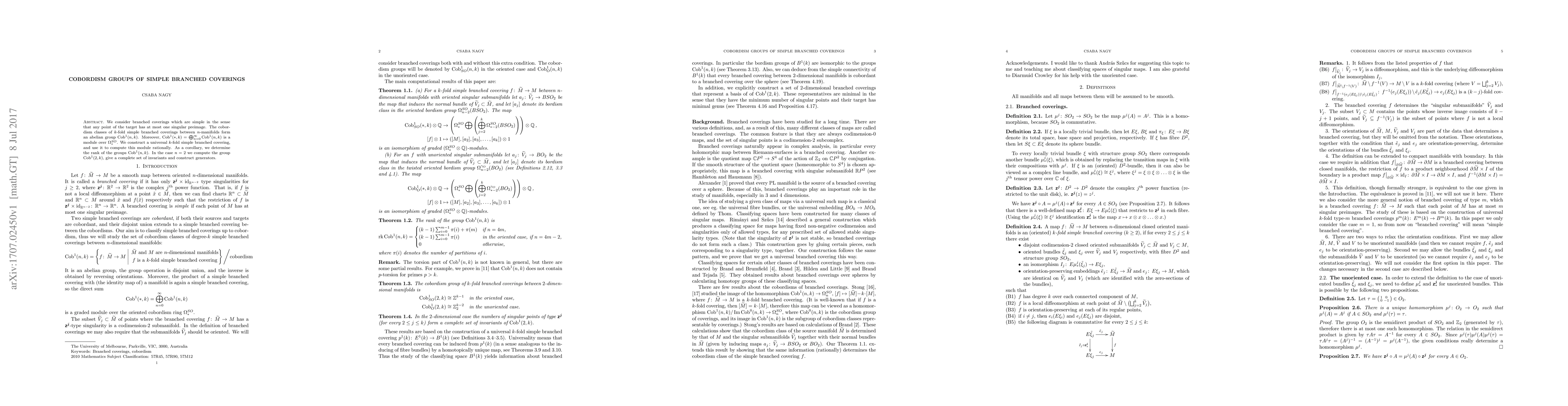 This paper studies the cobordism groups of $k$-fold simple branched coverings between $n$-manifolds, forming an abelian group $Cob^1(n,k)$. It constructs a universal branched covering and computes $Cob^1(*,k)$ rationally, determining the rank of $Cob^1(n,k)$ and providing a complete set of invariants and generators for $Cob^1(2,k)$.