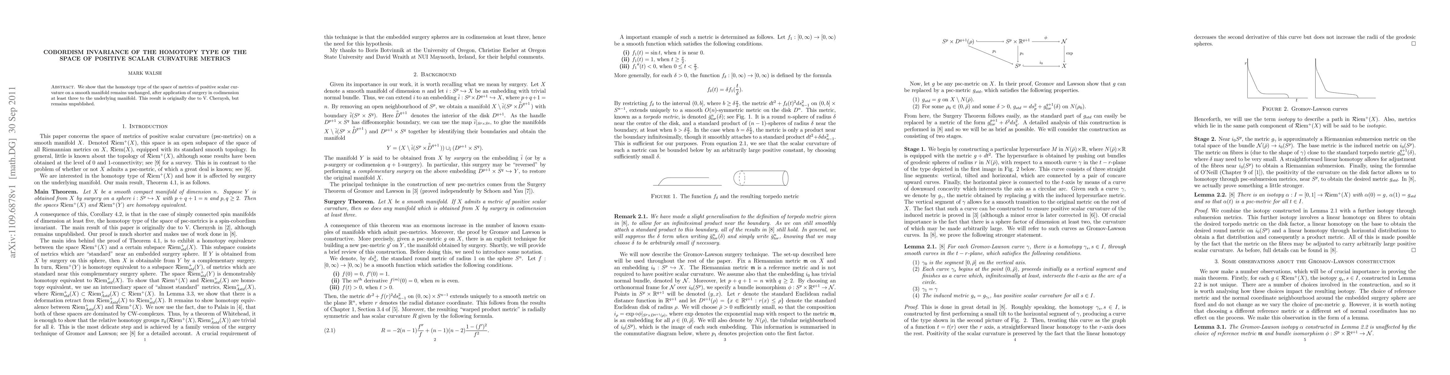 We show that the homotopy type of the space of metrics of positive scalar curvature on a smooth manifold remains unchanged, after application of surgery in codimension at least three to the underlying manifold. This result is originally due to V. Chernysh, but remains unpublished.