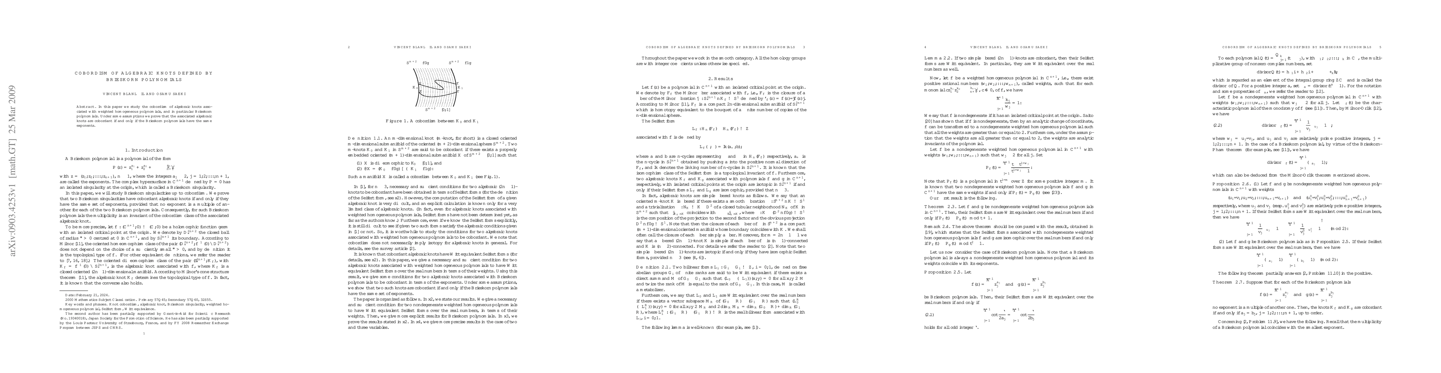 The paper presents proofs and propositions linking the cobordism of algebraic knots to the equivalence of Brieskorn polynomial exponents, utilizing Seifert forms and characteristic polynomials.