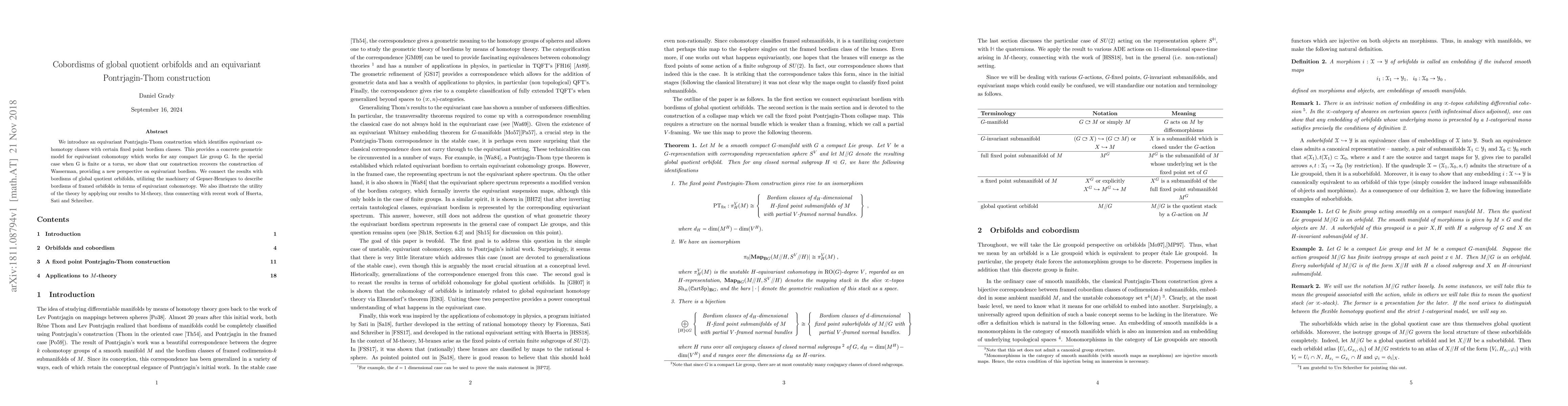 This paper introduces an equivariant Pontrjagin-Thom construction linking equivariant cohomotopy classes to fixed point bordism classes for any compact Lie group G, providing a new geometric model for equivariant cohomotopy. It connects these results with the bordisms of global quotient orbifolds and applies the theory to M-theory.