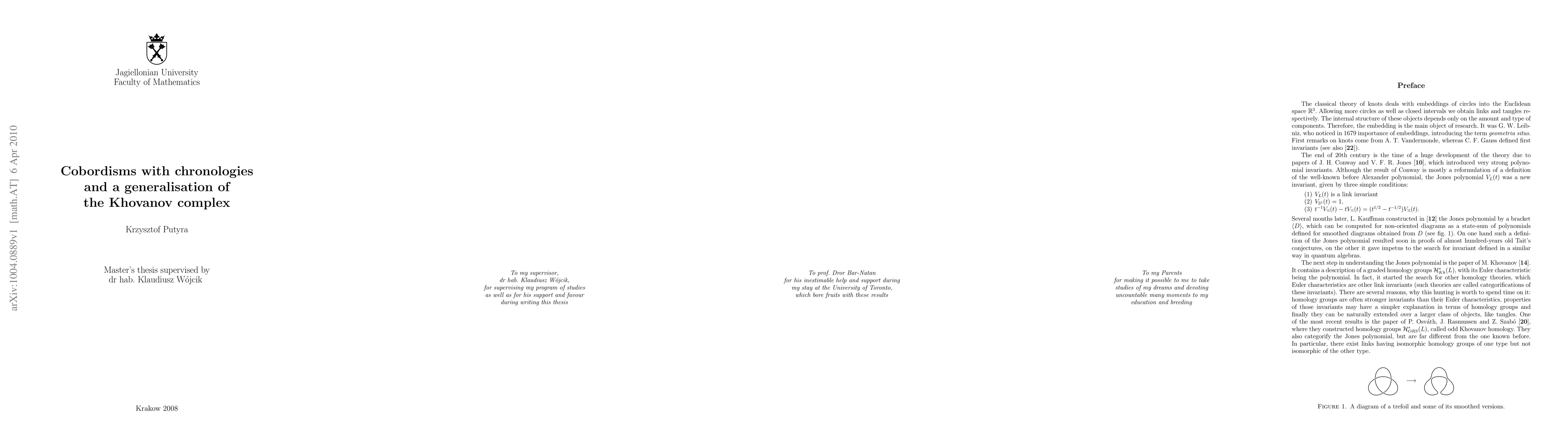 There are two categorifications of the Jones polynomial: "even" discovered by M.Khovanov in 1999 and "odd" dicovered by P.Ozsvath, J.Rasmussen and Z.Szabo in 2007. The first one can be fully constructed in the category of cobordisms (strictly: in the additive closure of that category), where we can build a complex for a given tangle and show its invariance under Reidemeister moves. The even link homology is given by a monoidal functor from cobordisms into modules. However, odd link homology cannot be obtained in this way. In this paper I fill this gap. I enrich cobordisms with chronologies (projections onto intervals which are Morse separable functions) and show that they form a category. Given a tangle diagram I take the cube of its resolutions and build a complex in this new category. I show this complex is a tangle invariant and applying appropriate functors I can recover both even and odd link homology theories.