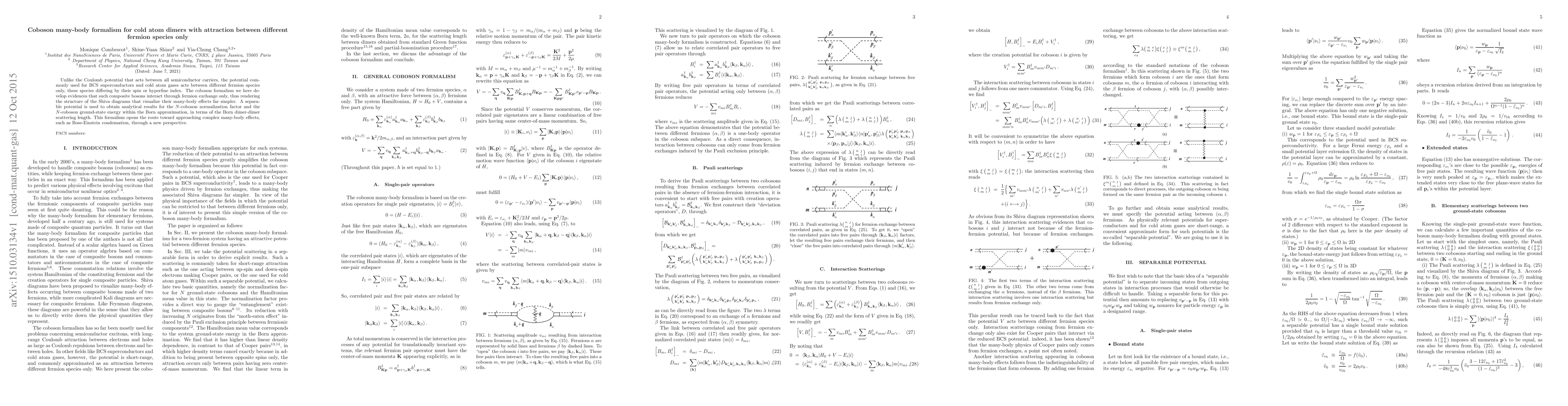 Unlike the Coulomb potential that acts between all semiconductor carriers, the potential commonly used for BCS superconductors and cold atom gases acts between different fermion species only, these species differing by their spin or hyperfine index. The coboson formalism we here develop evidences that such composite bosons interact through fermion exchange only, thus rendering the structure of the Shiva diagrams that visualize their many-body effects far simpler. A separable potential is used to obtain analytical results for the $N$-coboson normalization factor and the $N$-coboson ground-state energy within the Born approximation, in terms of the Born dimer-dimer scattering length. This formalism opens the route toward approaching complex many-body effects, such as Bose-Einstein condensation, through a new perspective.