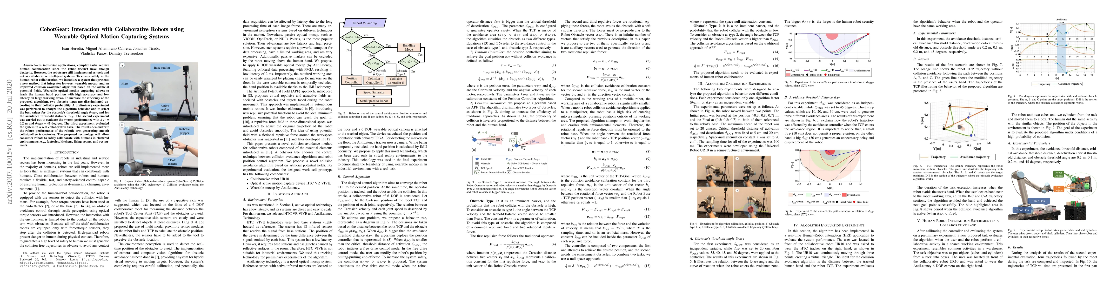 This paper introduces CobotGear, a system using low-cost wearable optical motion capturing to enhance human-robot collaboration in industrial settings, integrating an improved collision avoidance algorithm. Experiments show robust performance in generating smooth, collision-free robotic arm movements, promising safe collaboration in various environments.