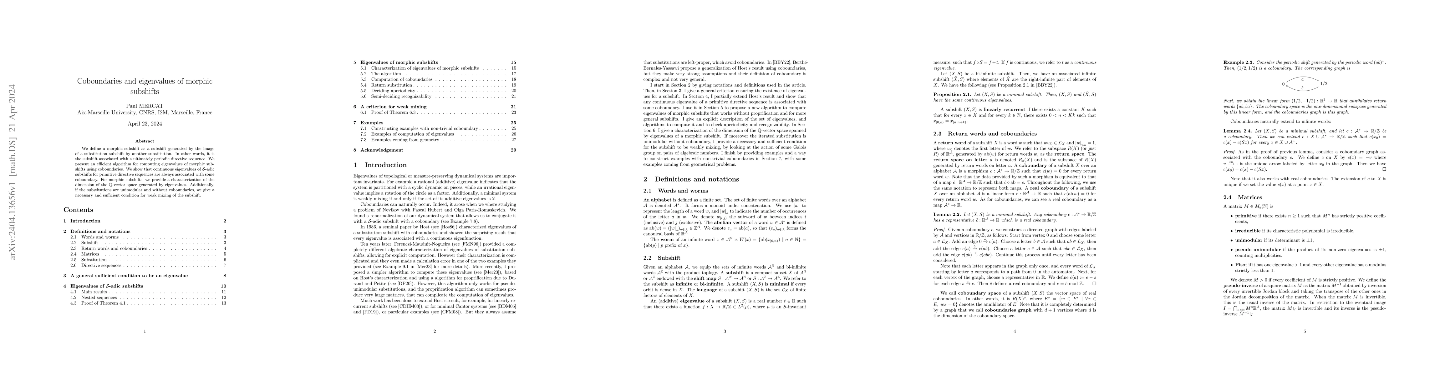 This paper introduces morphic subshifts and develops an algorithm to compute their eigenvalues using coboundaries. It characterizes the dimension of the Q-vector space of eigenvalues and provides a condition for the weak mixing of these subshifts when the substitutions are unimodular and without coboundaries.